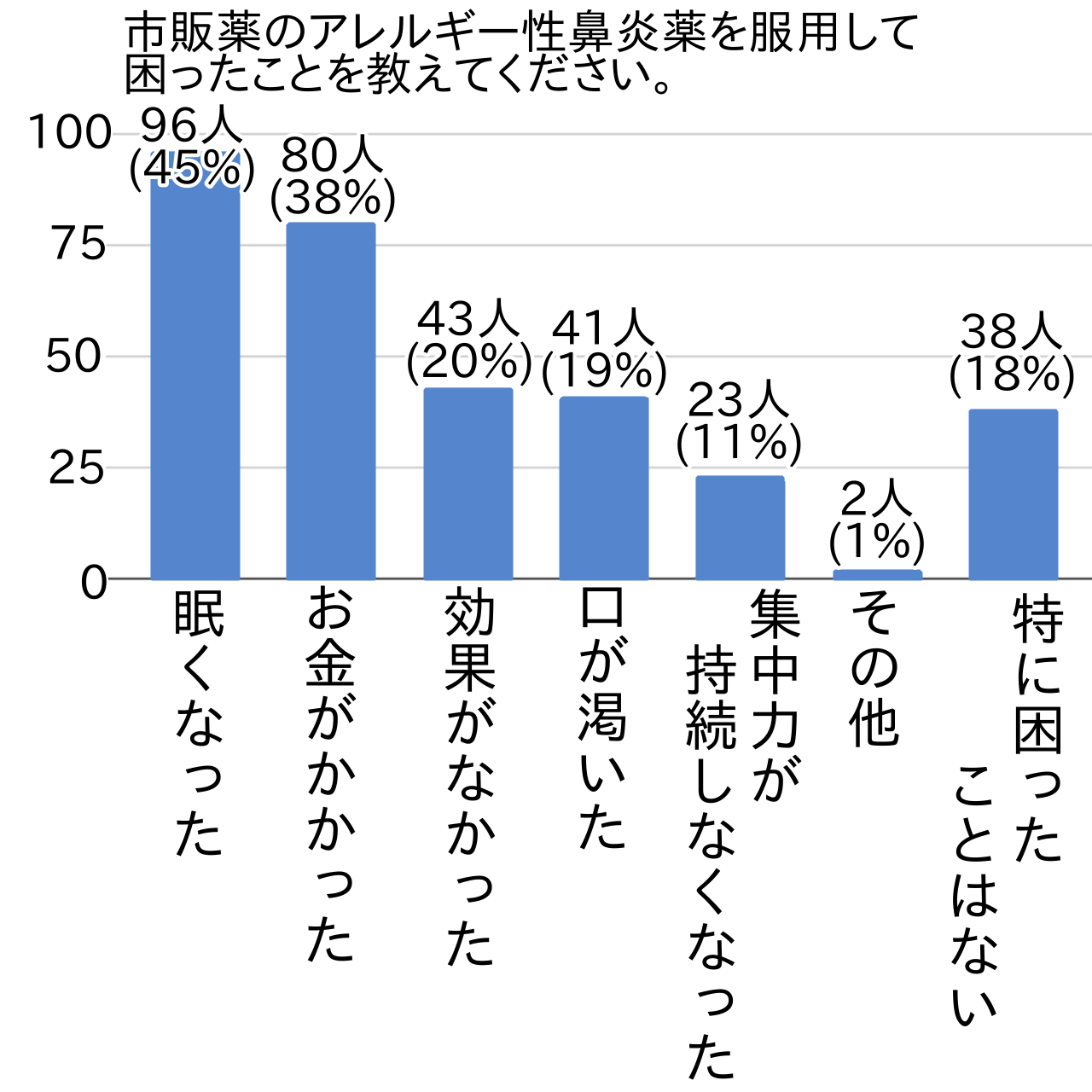 市販薬のアレルギー性鼻炎薬を服用して困ったことの第1位は「眠くなった(96人)」で、服用経験のある方の45%が服用による眠気を経験していました。