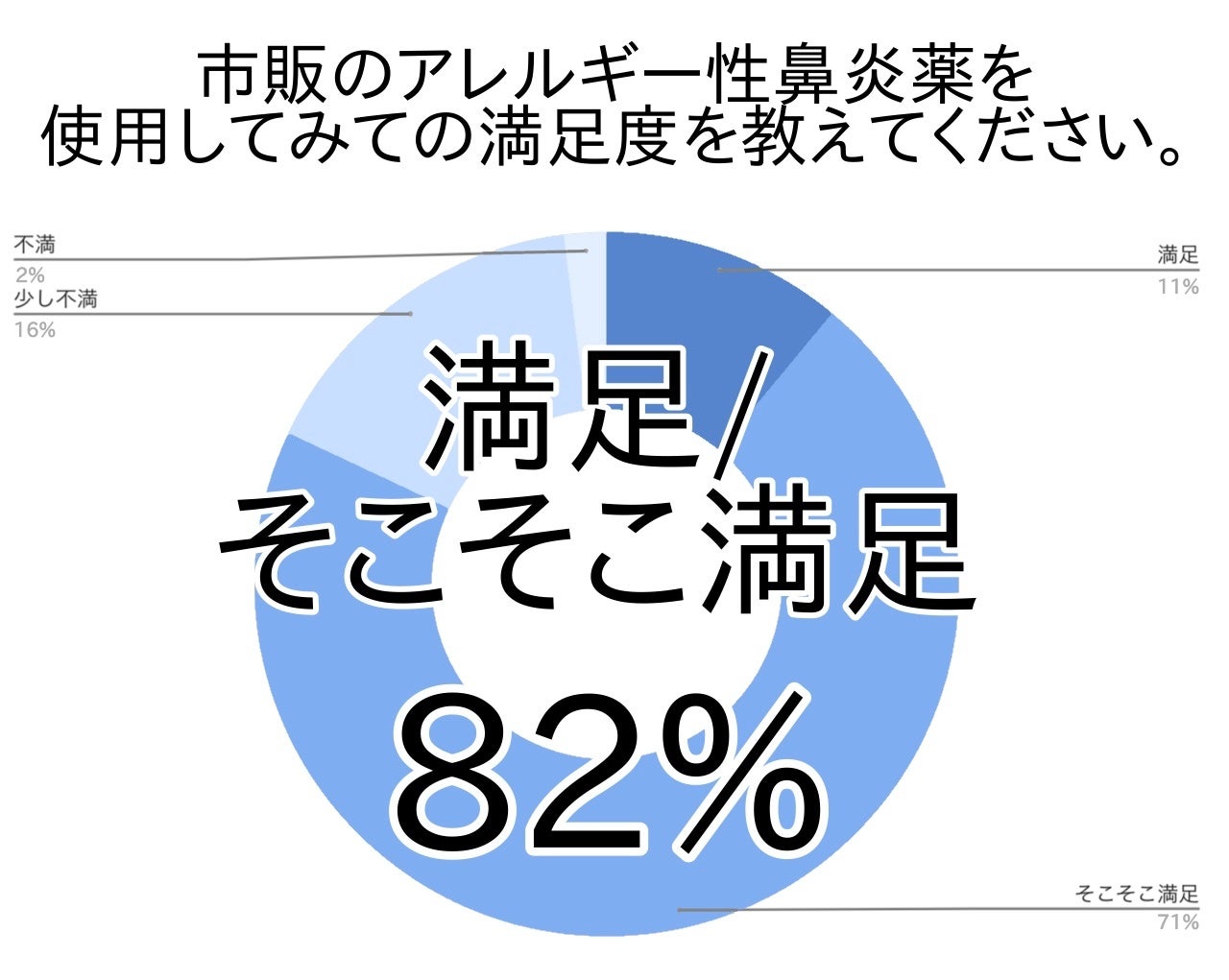 最も多かったのは「そこそこ満足(71%)」でした。「満足(11%)」と合わせると、市販のアレルギー性鼻炎薬を使用してみて、おおむね満足していると判断している方は8割強(82%)でした。