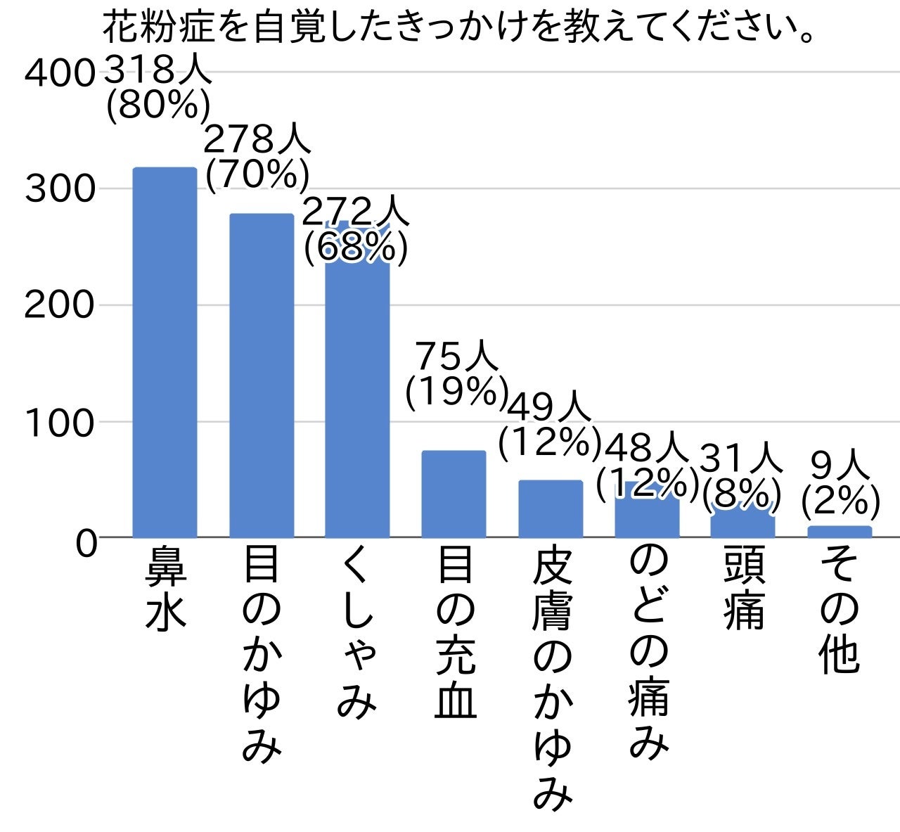 第1位は「鼻水(318人)」で8割(80%)を占めました。第3位の「くしゃみ(272人)」とともに、鼻症状が気になる方が最も多いようです。