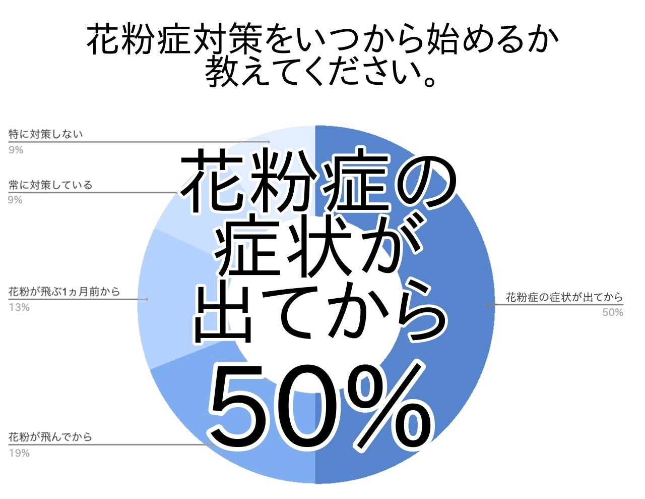 花粉症対策を始めるタイミングに関して、第1位は「花粉症の症状が出てから(50%)」で、半数を占めました。