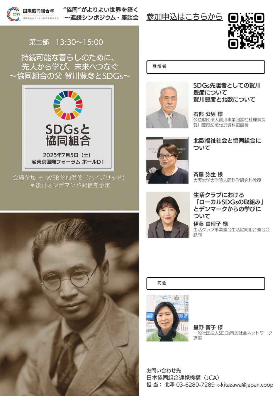 2025年7月5日(土) 【第一部】 10:30~12:15 SDGsと協同組合~実践状況、達成への課題と期待 【第二部】 13:30~15:00 持続可能な暮らしのために、先人から学び、未来へつなぐ ~協同組合の父 賀川豊彦とSDGs~ |
