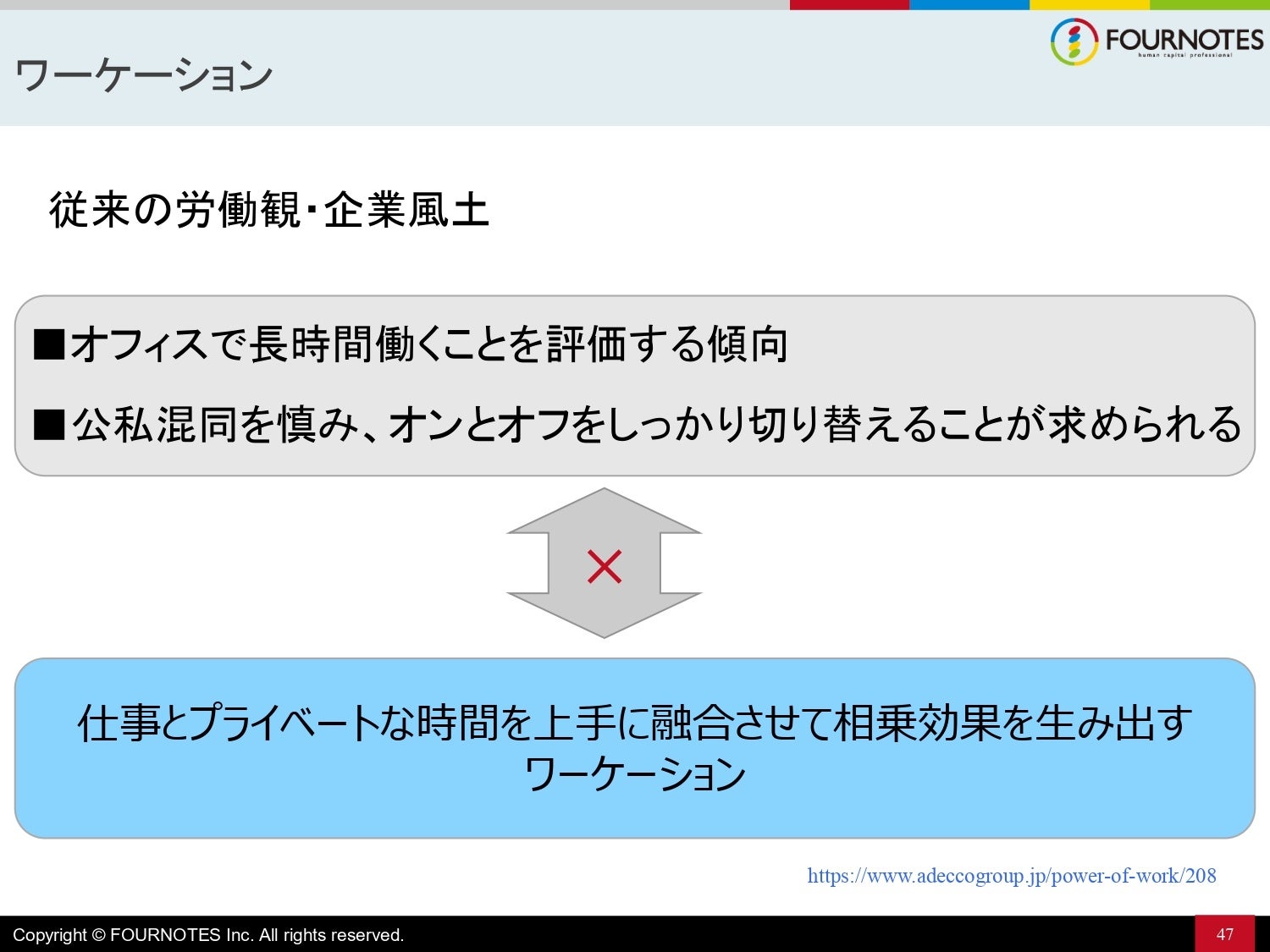 総合人事コンサルティングのフォー・ノーツ株式会社(所在地:東京都港区)は、代表取締役社長・西尾太の著書『超ジョブ型人事革命』(日経BP)出版記念特別セミナー第二弾「高付加価値人材はワーケーションで育成せよ〜週5日の出社、まだ必要ですか?〜」を2021年11月17日(水)に、開催いたしました。