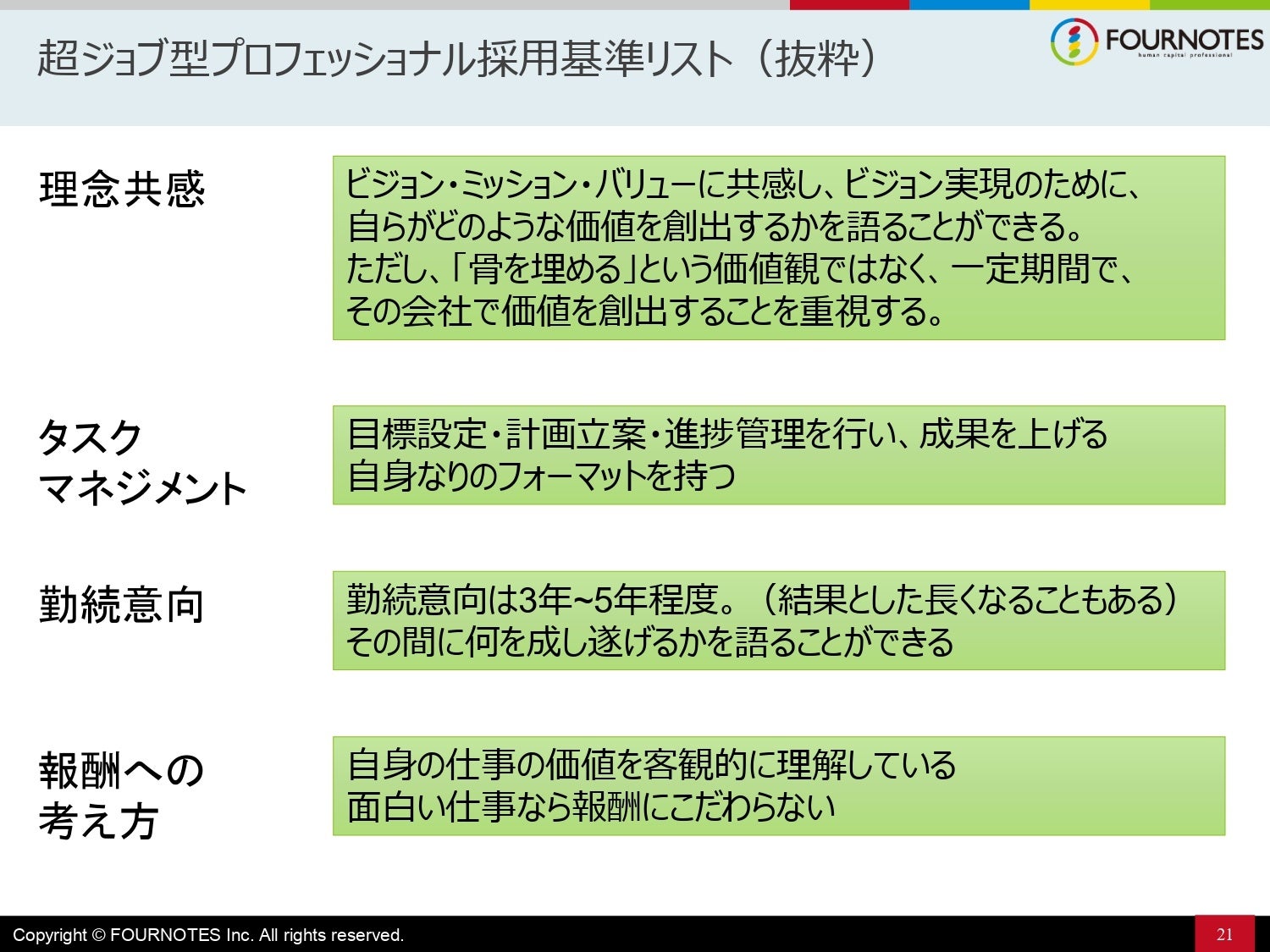 これは『超ジョブ型人事革命』でも紹介している「どこでも働ける人材」=「超ジョブ型プロフェッショナル」の採用基準の抜粋ですが、こういう働き方・考え方をしている人たちは、実際に多くいます。こうした人材を確保するためにも、多様な働き方を認めることがすごく大事です。それが例えばテレワークやワーケーション、そして週4・週3社員といったものになっていきます。
