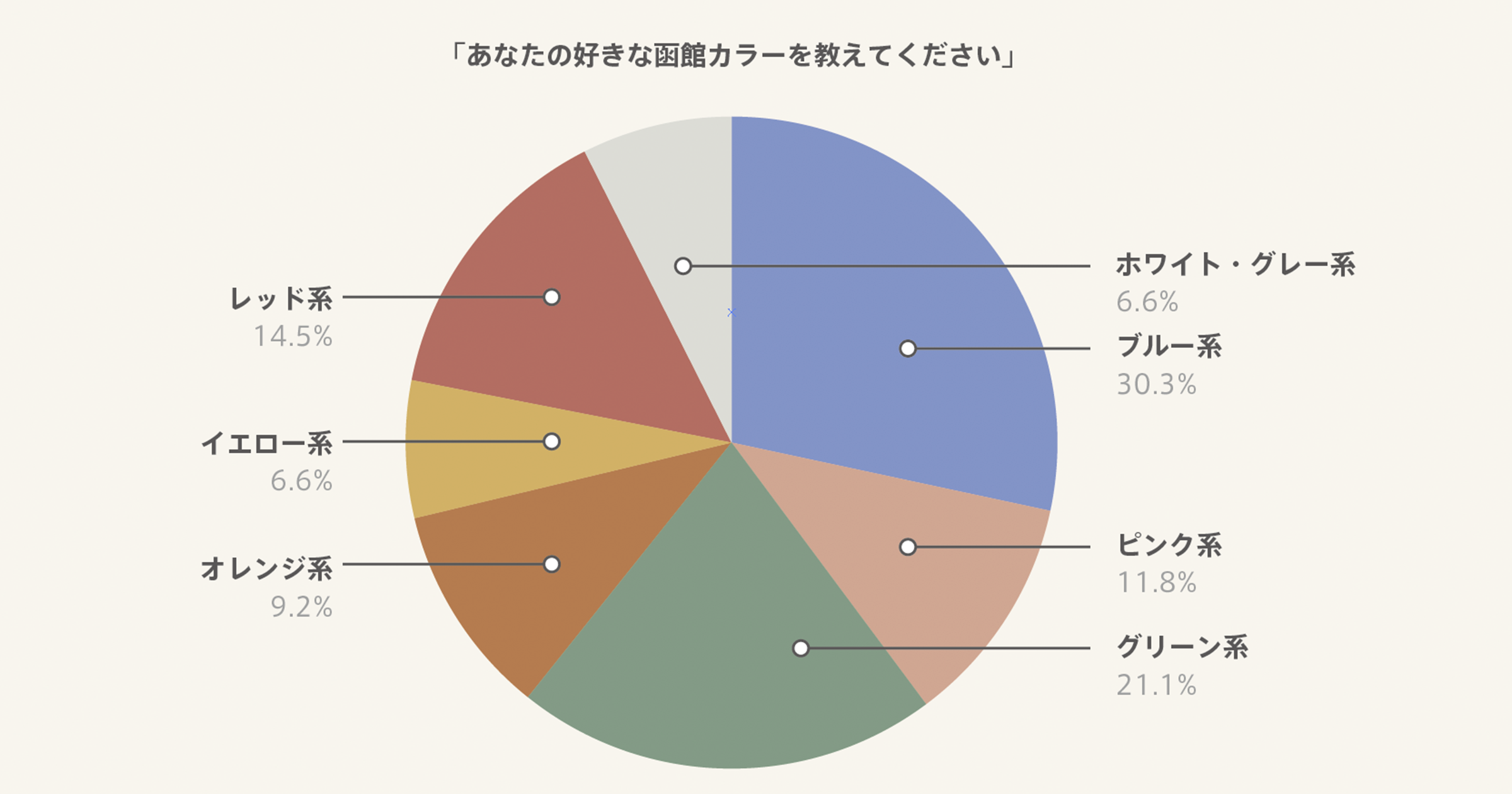 約100名の方々からいただいた応募を集計したところ、レッド系、ピンク系、オレンジ系、イエロー系、グリーン系、ブルー系、ホワイト・グレー系の色とりどりの「函館カラー」が集まりました。