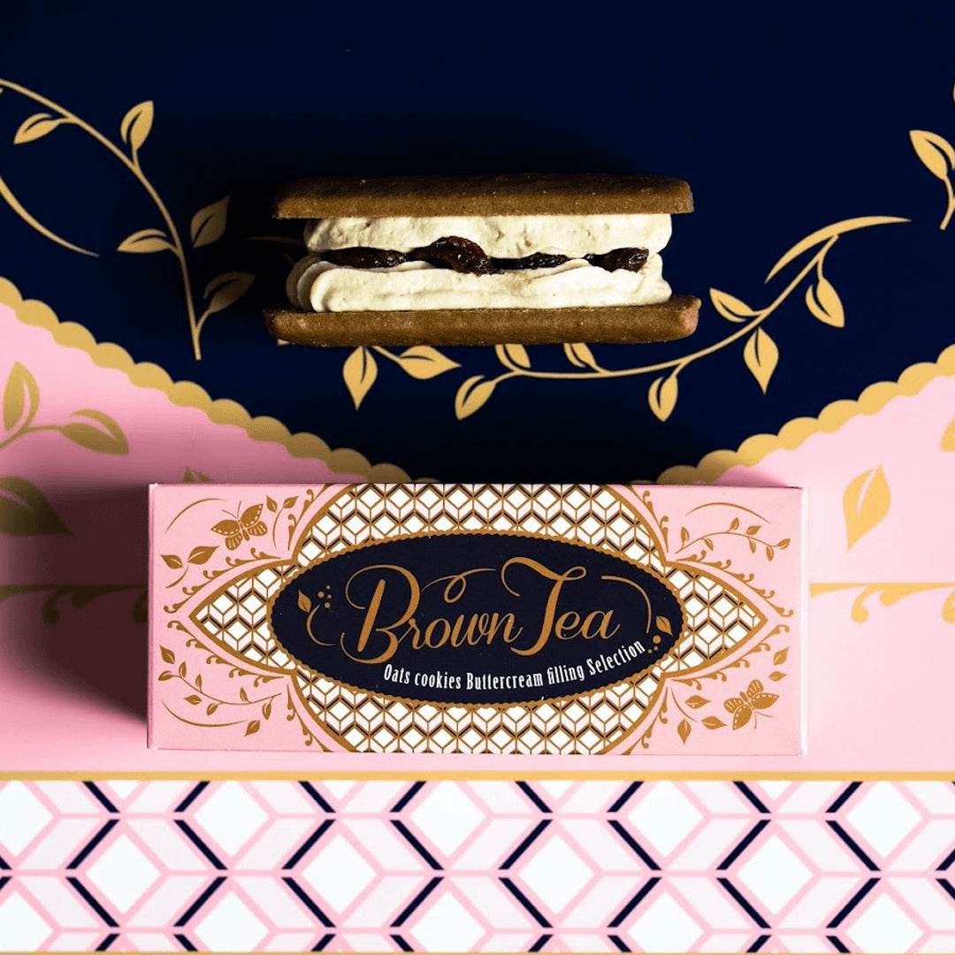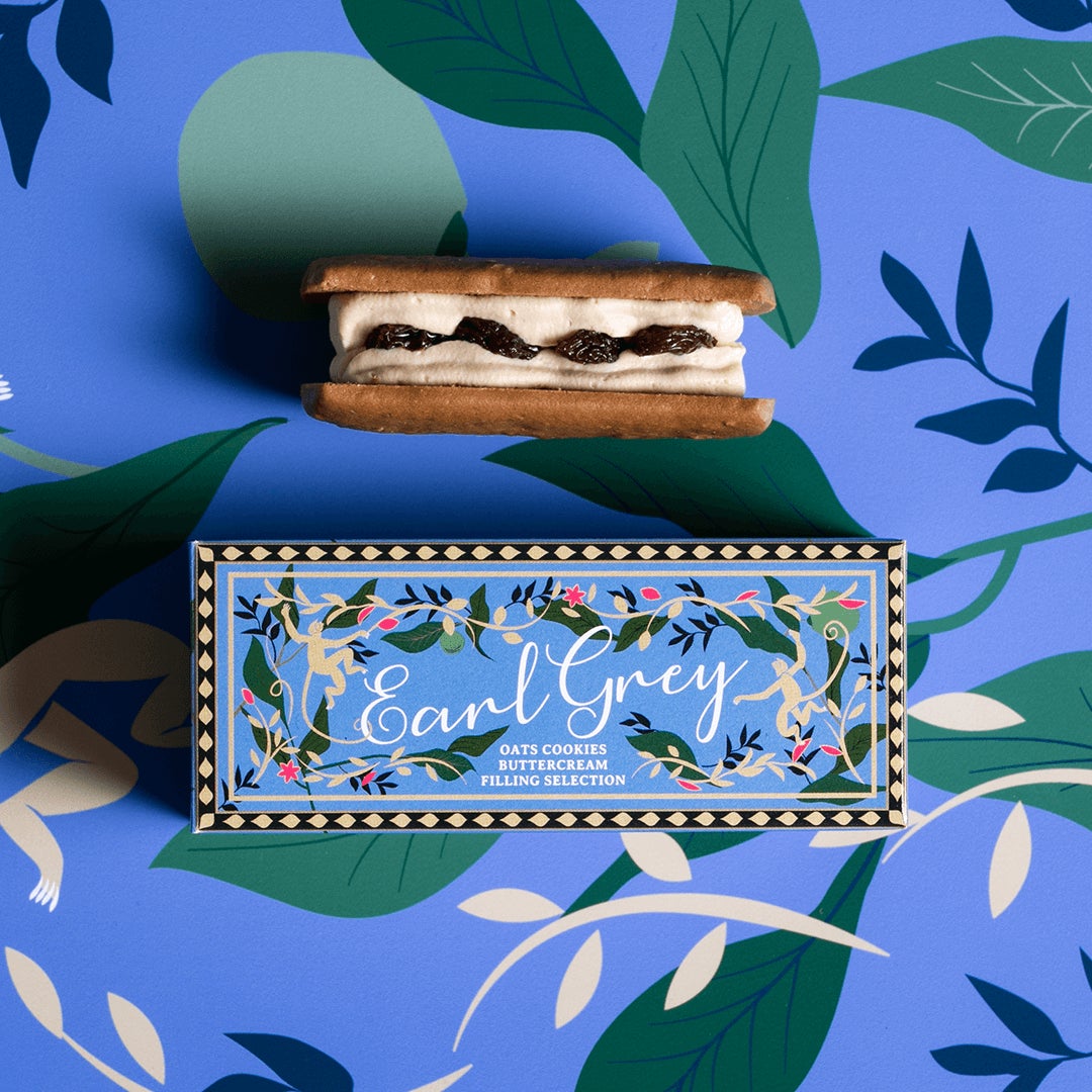 アールグレイ(ウバ茶使用)の茶葉を練り込んだオーツクッキーに、香り高いブランデーレーズンとアールグレイ風味のバタークリームをはさみました。バタークリームがベルガモットの香り豊かなミルクティのような味わい。