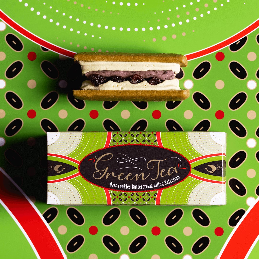 宇治抹茶を使用し、塩味のきいたオーツクッキーを焼き上げました。バタークリームにも抹茶を配合し、粒あんとブランデーレーズンを加えてサンド素材を贅沢に使用したリッチで深い味わい。