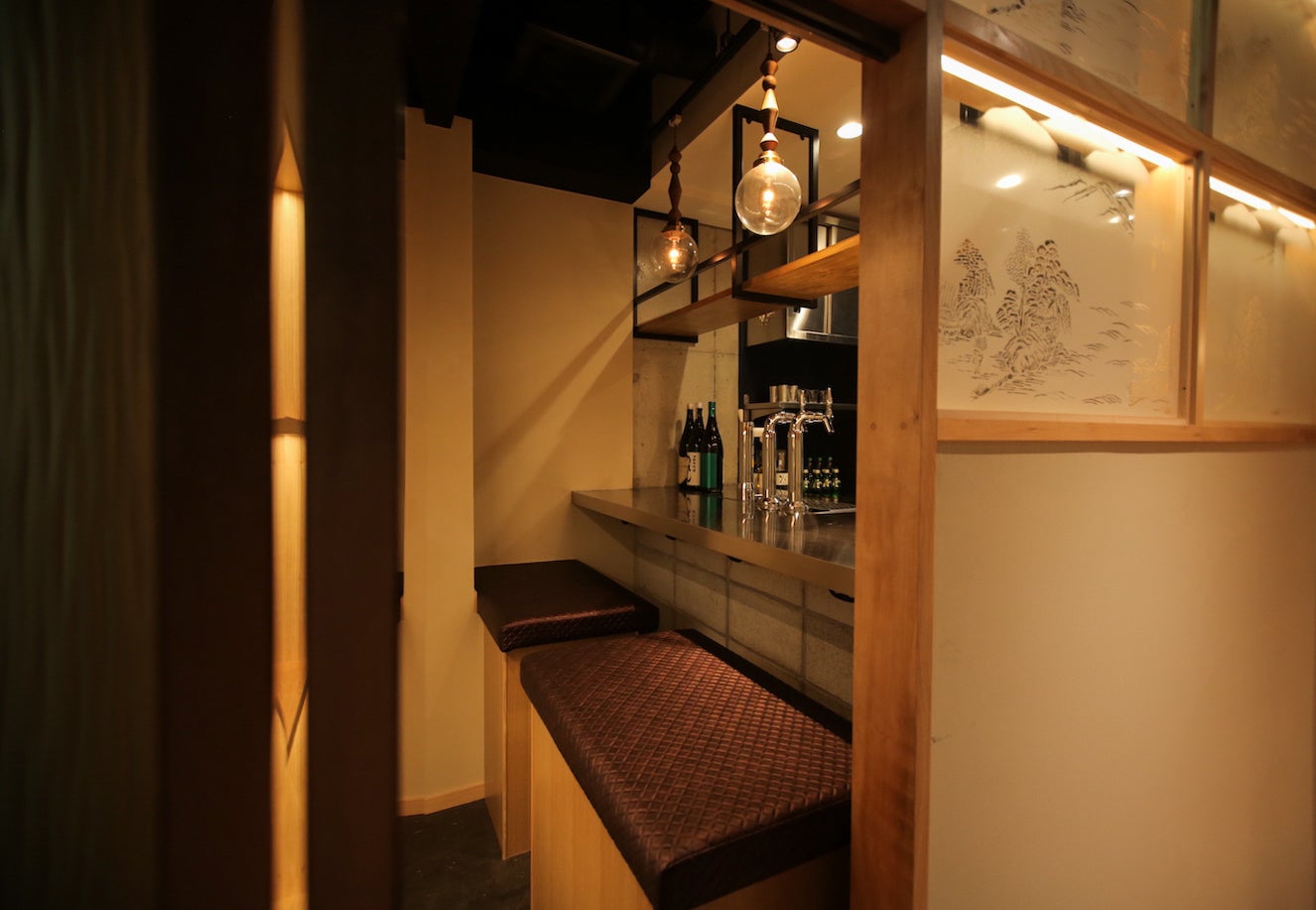 中目黒店は、14席のカウンターの他にも、恵比寿店や麻布十番店にはない Makuake会員様”だけ”が利用できる「プライベートバー」を併設致しました。 2名様掛けの2席をご用意しています。早めに到着時の一杯、コース時間終了後のもう一杯、などそれぞれのシーンに合わせてご利用いただけます。鮨の余韻に浸り、会員様しか味わえない至福のひとときをご堪能ください。