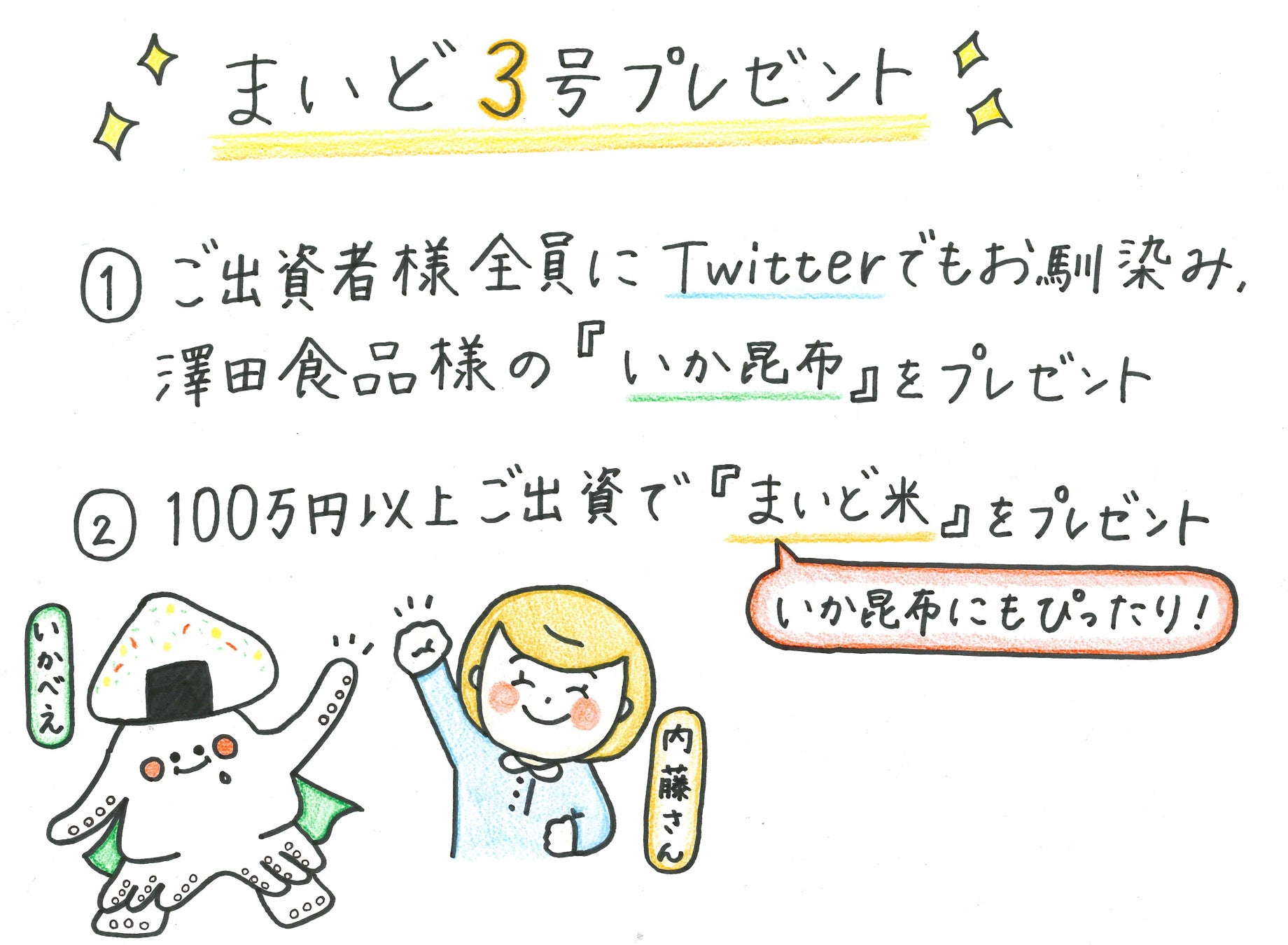 100万円以上ご出資いただいた方には、まいど米もプレゼント。