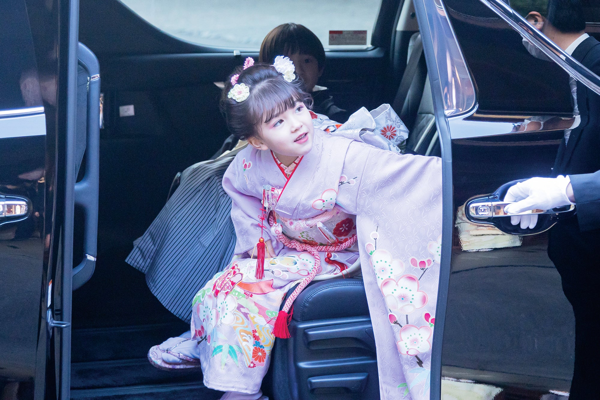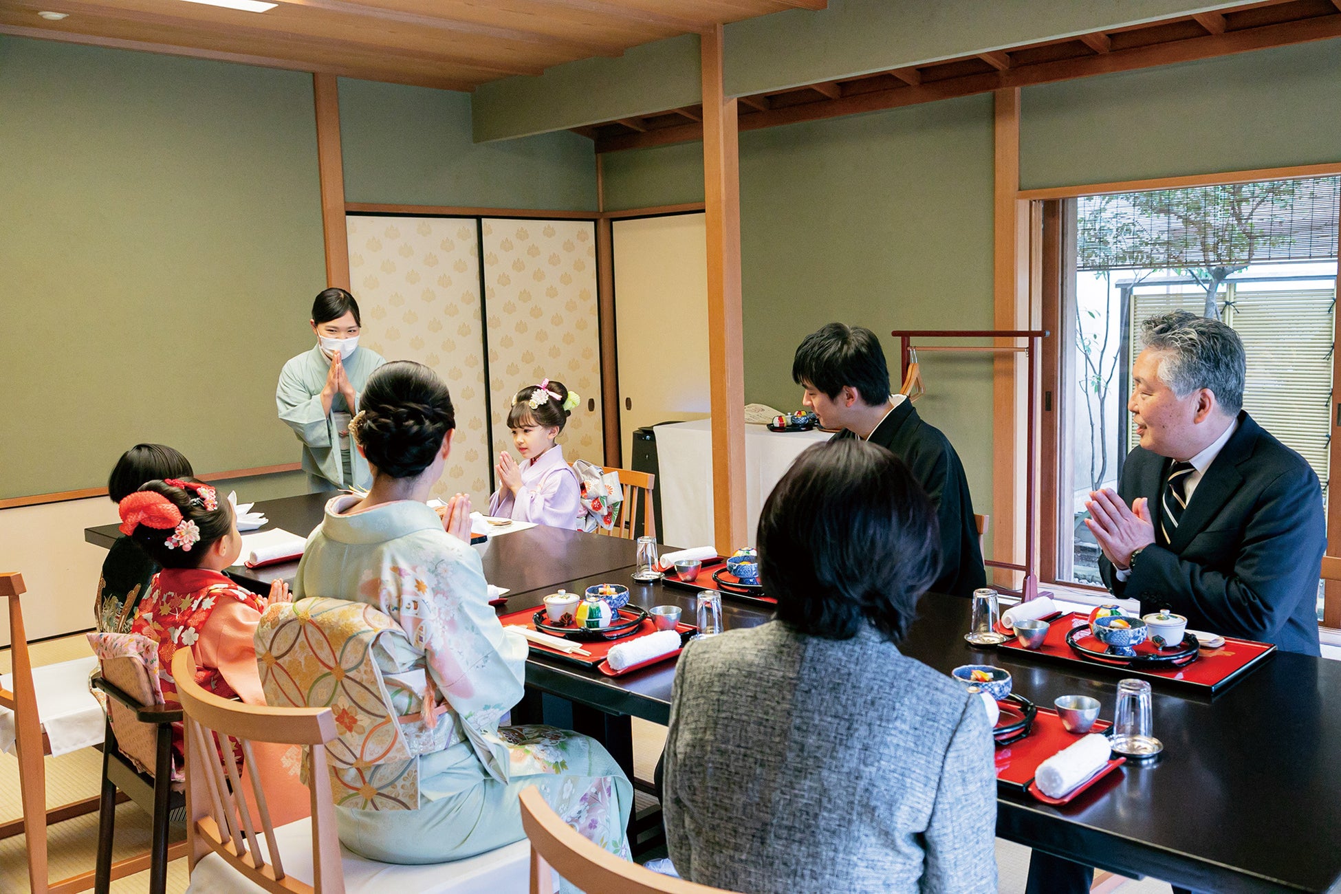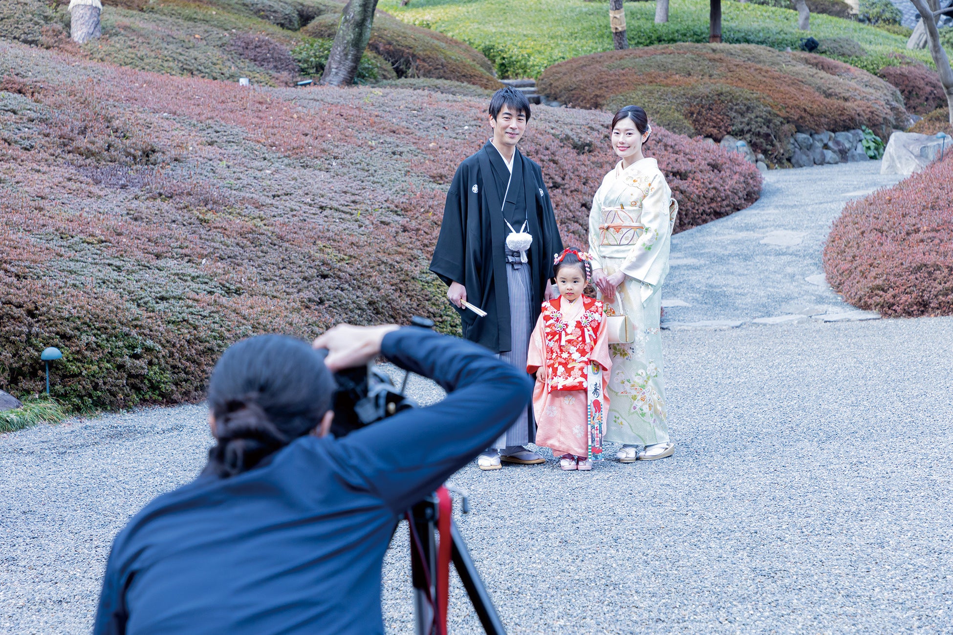 お祝いの前日にご自宅にスタッフが伺い、お召しになる衣裳のお納めと設置をおこないます。当日のお仕度は全てご自宅にて行い、お支度が終わりましたらハイヤー(日本交通株式会社)で神社へ。当日の駐車場の心配もありません。また、撮影スタッフも同行し大切なシーンをカメラに収めます。美容スタッフもアテンドしていますので、着くずれもすぐにスタッフが対応いたします。ご祈祷の後は、会食の会場へ移動。都内で指折りの広さの美しい日本庭園を持つ八芳園内の料亭、『壺中庵』でのお食事(基本プランではお子さま1名分と大人2名さま分)が含まれます。そのほかオプションも豊富にご用意致しておりますので、ご利用人数を増やし祖父母の皆さまともご一緒に会食をお召し上がりいただくことも、終日の様子を動画で映画のように収め編集するシネマチック編集をお選びいただくことも可能です。