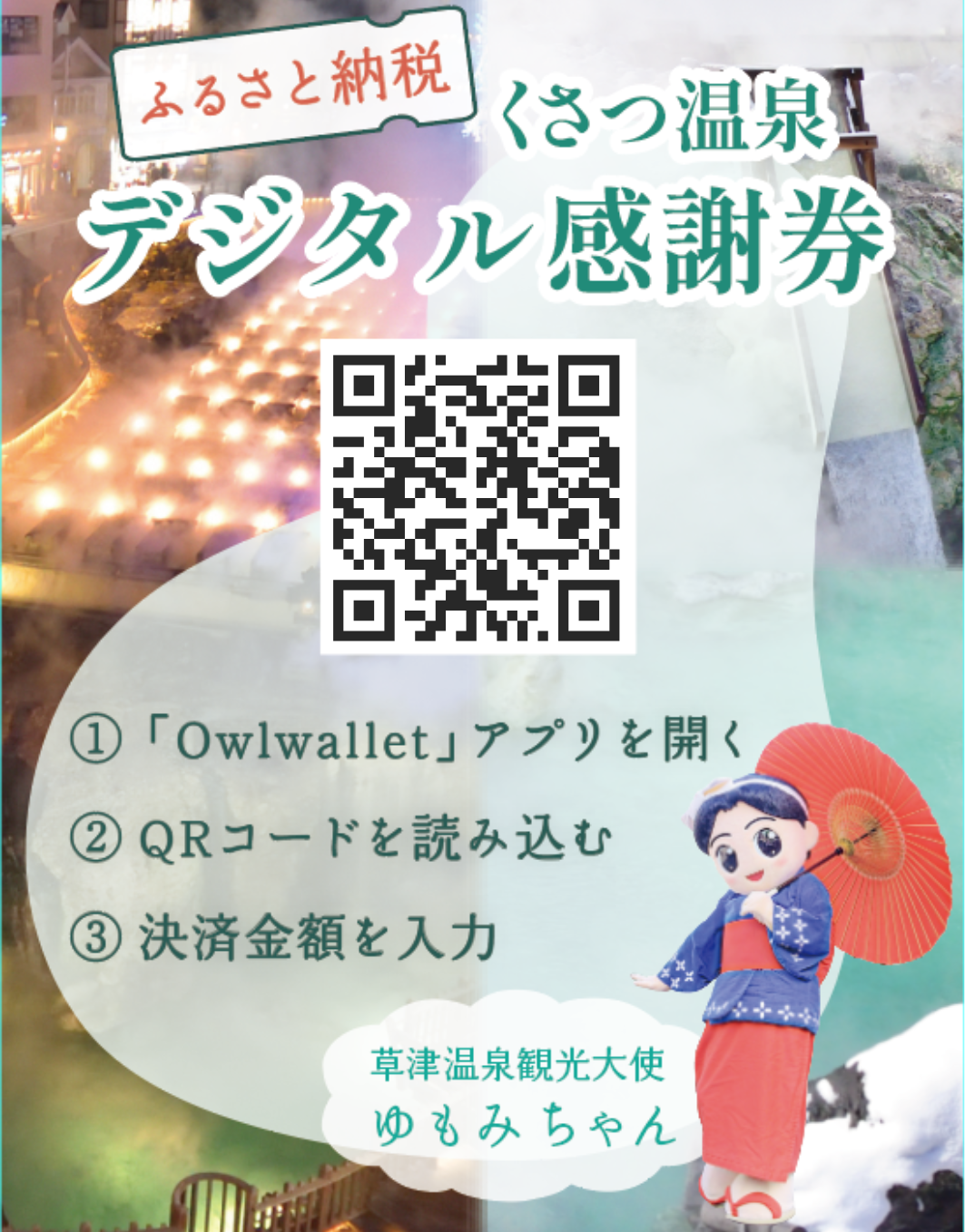 寄附者は、ふるさと納税の返礼として専用アプリ上でデジタル感謝券を受け取り、草津町内の宿泊施設をはじめとする参加事業者にて1円単位で自由に利用できます。紙券に伴う「使い切れない」「管理が煩雑」といった課題を解消し、スマートフォンひとつでスムーズに決済可能な体験を提供します。