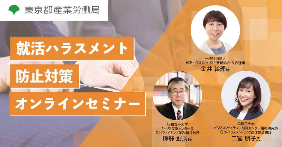 東京都産業労働局が運営する「TOKYOノーハラ企業支援ナビ」上で開催の「就活ハラスメント防止対策オンラインセミナー」についてはこちらをご覧ください。