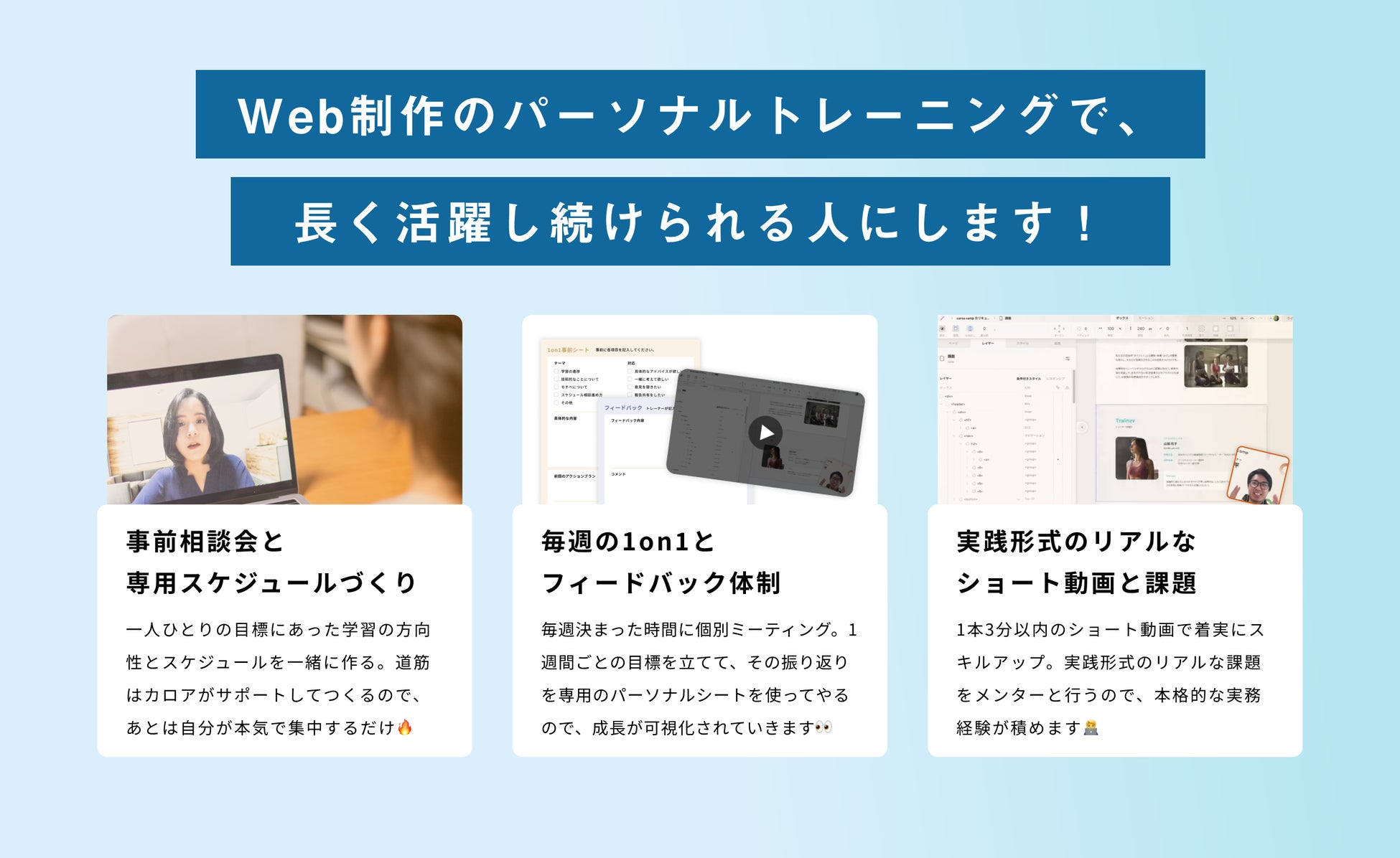 企画、設計、ディレクション、Webデザイン、実装、運用、マーケティングなどWeb制作における必要な「技術スキル」と「コミュニケーションスキル」を幅広くメンターとともに学ぶことができます。(※今後リリース予定の内容も含みます。)