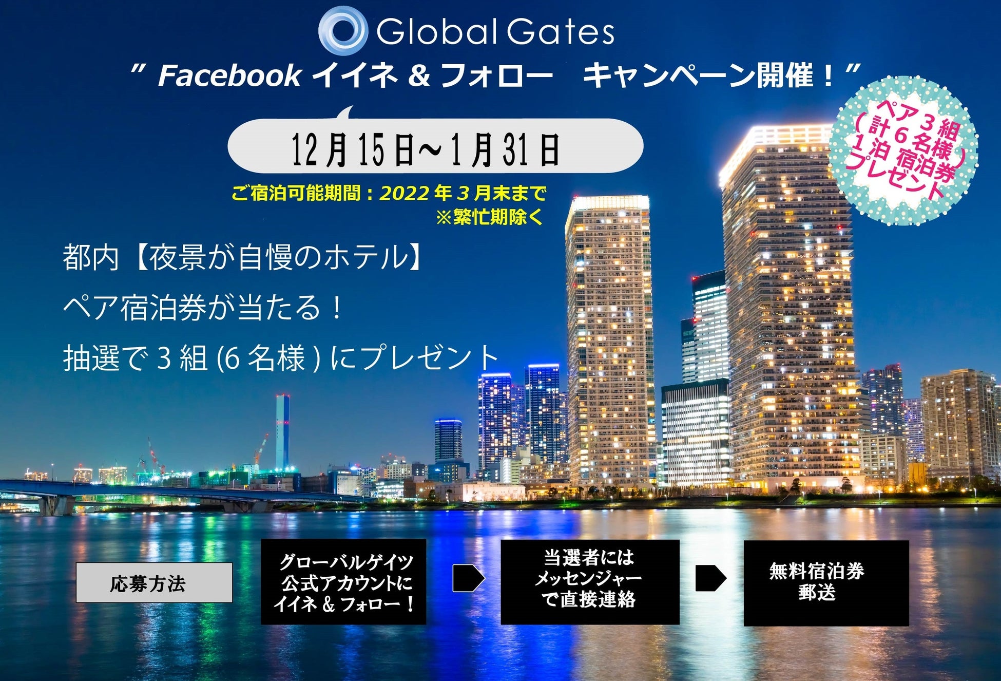 ホテルハウスキーピングマネジメントおよび総合商社 株式会社グローバルゲイツ (所在地:東京都中央区日本橋浜町3-16-7、代表取締役:梅村真行(うめむら まさゆき)は、2021年12月15日(水)~2022年1月31日まで、東京の絶景夜景が堪能できるホテルの宿泊券がもらえるキャンペーンを実施します。