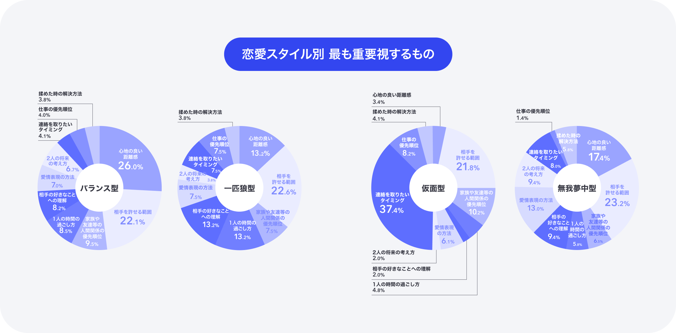・恋愛スタイル別の「最も重要視するもの」については4スタイルに共通して「相手を許せる範囲」を重視