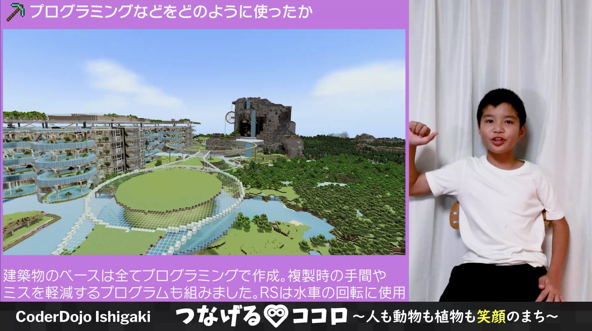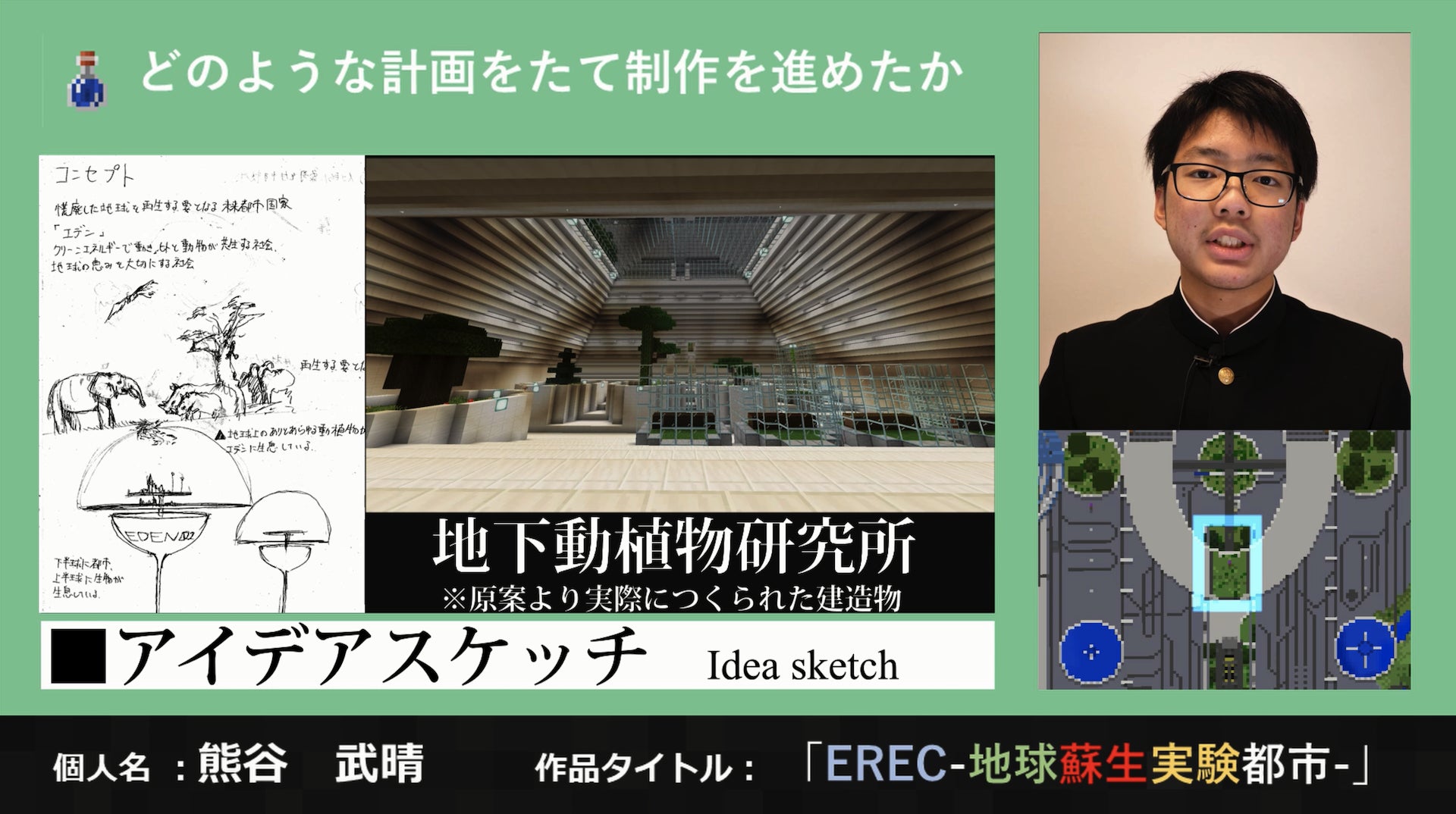 そして今回のテーマはSDGsという難しいものでしたが、難しいからこそ、入念に調べつつ想像力と奇抜なアイデアで取り組んでみようと思いました。マインクラフトを自分の表現手段として活用できたことにとても満足しています。
