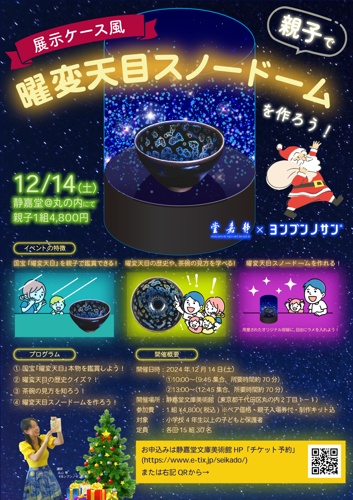 このイベントでは、国宝『曜変天目』実物を親子で鑑賞できるほか、茶碗鑑賞の基礎を知ることができ、さらに自分だけの「展示ケース型オリジナル曜変天目スノードーム(本ワークショップ限定)」を制作し持ち帰ることができます。