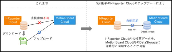 今回の連携により、「i-Reporter」内の報告書などの帳票データを、「MotionBoard Cloud」内のデータストレージに自動的に同期することが可能となります。