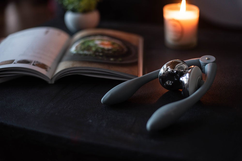 - 肌あたりなめらかな4つの突起付きステンレス製のマッサージボールが、少しの力で挟み込むようにしっかりプレス
