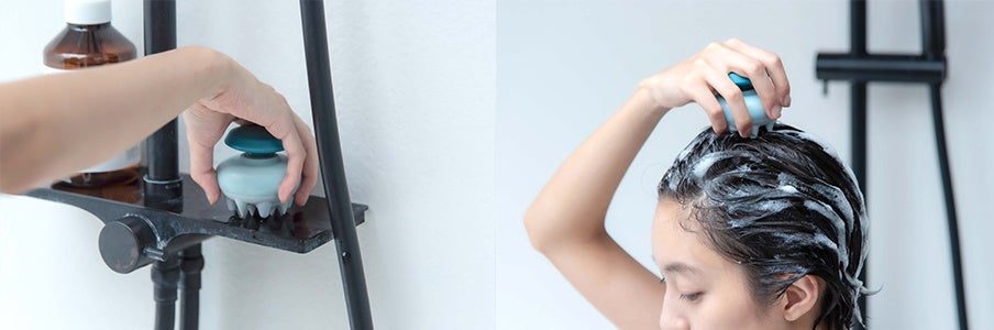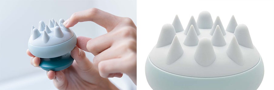 - シャンプー時すっきりトゲブラシ、頭皮をキャッチするユビブラシ、形状の異なる2種類のシリコンブラシ