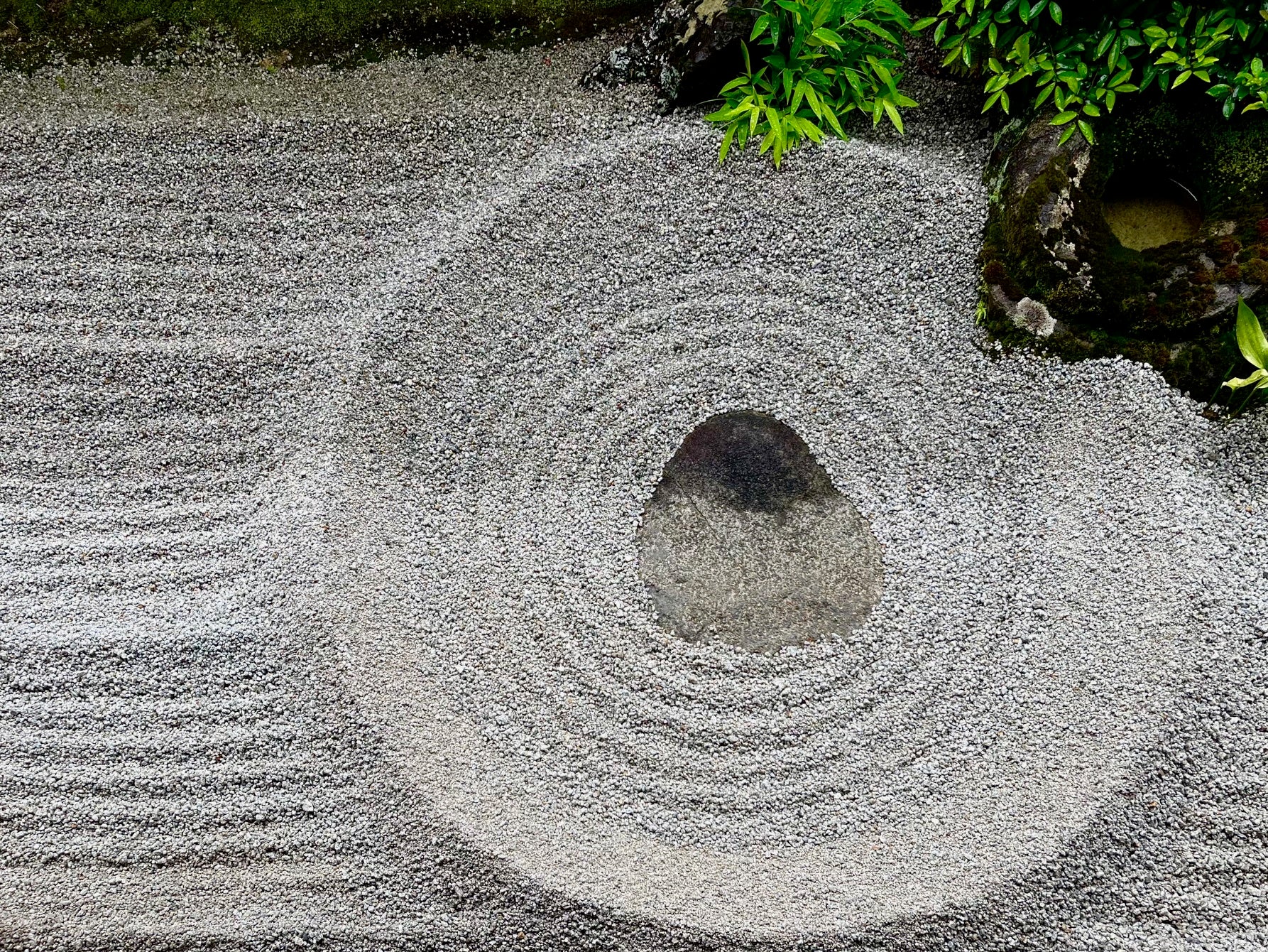枯山水は、日本庭園で観賞用として用いられることが多いです。ゆっくりと腰かけ、空間全体でお庭の意味を感じながら、静かに自分自身と向き合うことを目的とします。