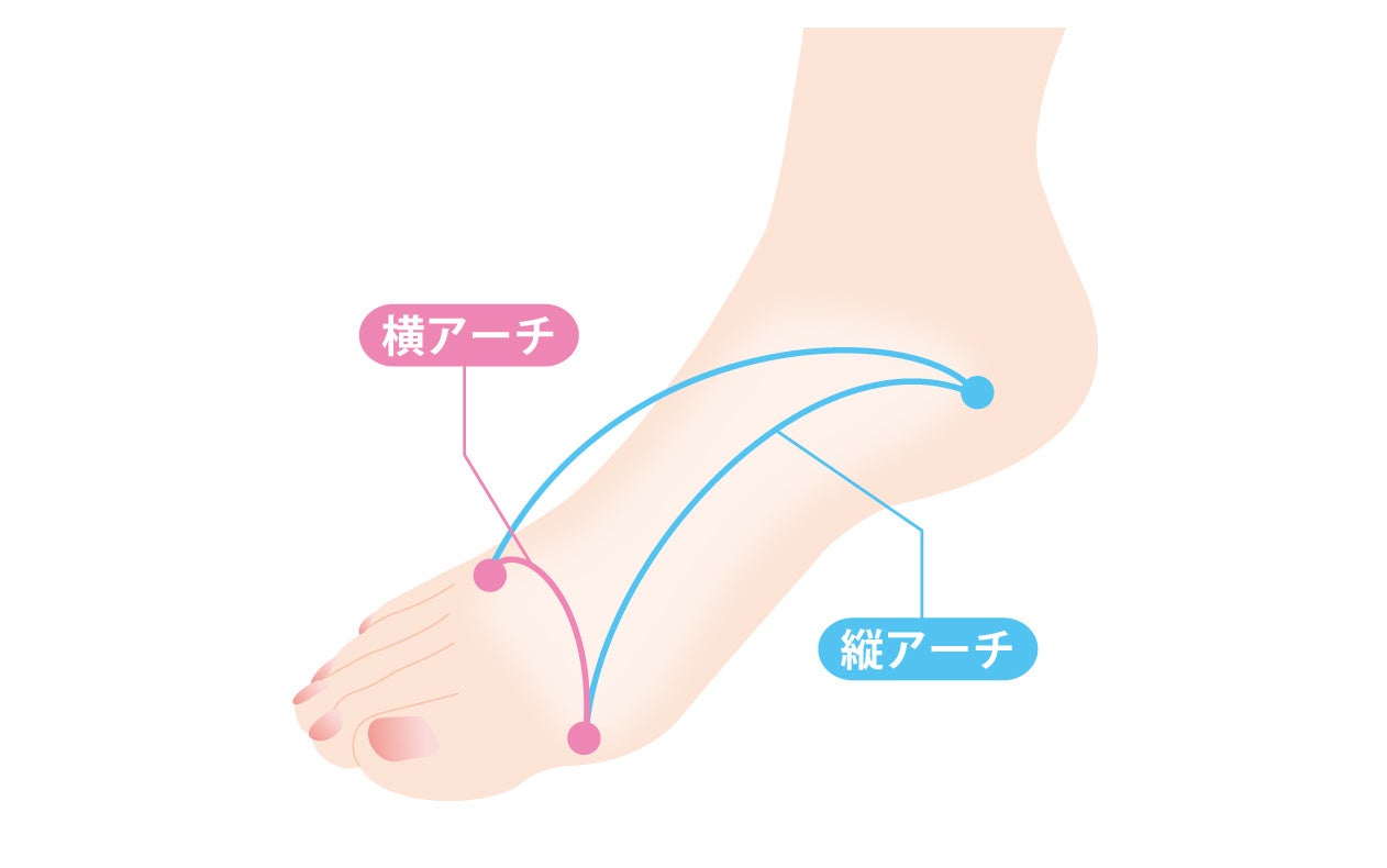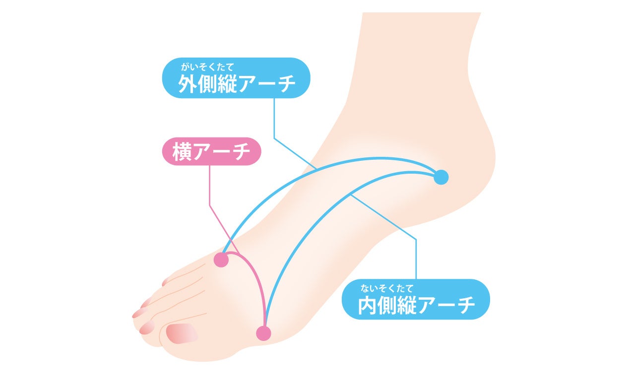 それらトラブルの一因となるのが足裏のアーチ崩れです。人間の足裏には内側縦アーチ、外側縦アーチ、横アーチという3つのアーチが組み合わさり、歩行時の衝撃を吸収しています。