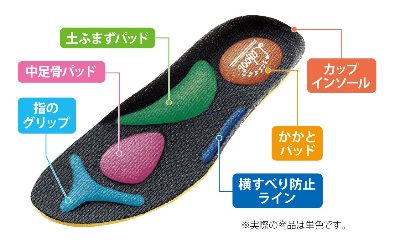 販売累計26万足を売り上げた「楽歩人®(ラフット)ソール」シリーズと同じ機能を持つインソールを内蔵しています。縦・横アーチを同時にサポートし、長時間履いていても疲れにくいです。