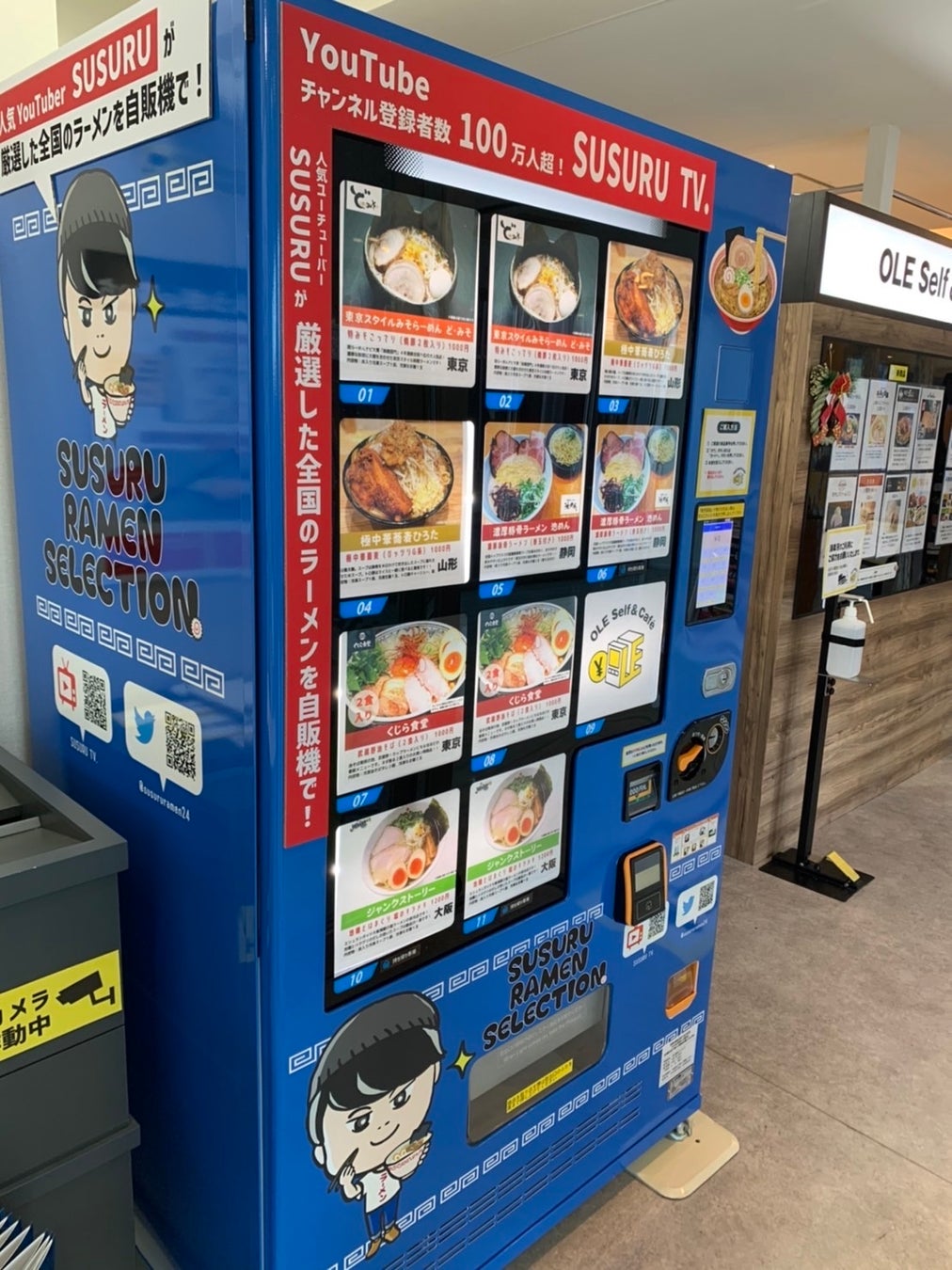 株式会社静鉄リテイリング(本社:静岡県静岡市、代表取締役:前田大輔)は、2021年7月に静岡県藤枝市にオープンした自動販売機・非対面店舗「OLE Self&Café」に人気YouTuber「SUSURU」のラーメンセレクションを設置致しました。YouTubeチャンネル登録者数100万人を超える人気チャンネル「SUSURU TV.」のSUSURUが厳選した日本全国のラーメンが自動販売機で24時間購入可能となります。