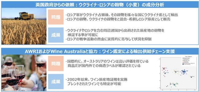 「産地の証印™」は日本に先んじて、海外で多くの実績があります。そのひとつが、穀物をめぐるウクライナ-ロシア間の問題です。ロシア軍によるウクライナ占領の際、ロシア軍がウクライナの穀物を占有し、多くの国々に輸出していることが明らかになりました。それだけではなく、本来はウクライナ産である穀物をロシア産の穀物と混合したり嵩増ししたりして、ロシア産として販売され、その利益が戦争の資金源になっていることが証明されたのです。他にも、コーヒーやワイン、アワビ、肉類など、あらゆる食品や加工品での実績がございます。