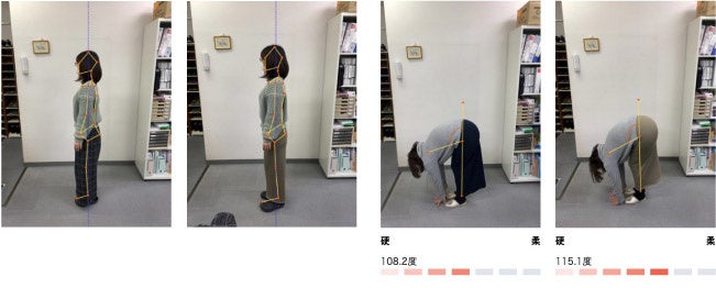 姿勢の改善を可視化するために東京大学初発のスタートアップ企業「株式会社Sapeet」社製のAI技術を用いた姿勢解析と運動解析を行いました。