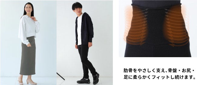姿勢を支えるために「肋骨」を支え、姿勢の崩れを防止させます。ズボンと一体化させることで衣類のズレを防ぎ、素材を保温性に優れたものを採用することで、防寒対策も可能にしました。