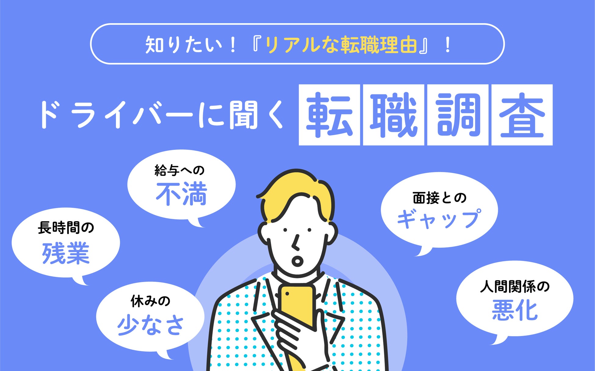 運送業界は『人材不足』という大きな課題を抱えています。ドライバーの離職を防ぐためにはどうすればいいのか。ドライバーの採用を成功させるためにはどうすればいいのか。実際に、ドライバーが転職する際に「何を考えているのか」を、知りたいという管理職・採用担当の方も多いのではないでしょうか。