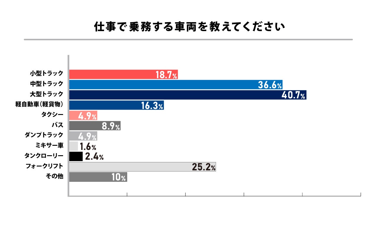 「仕事で使用している車両」に関しては、中型トラックが37%、大型トラックが39.5%と過半数を占めており、続いて小型トラックが19.3%という結果になりました。