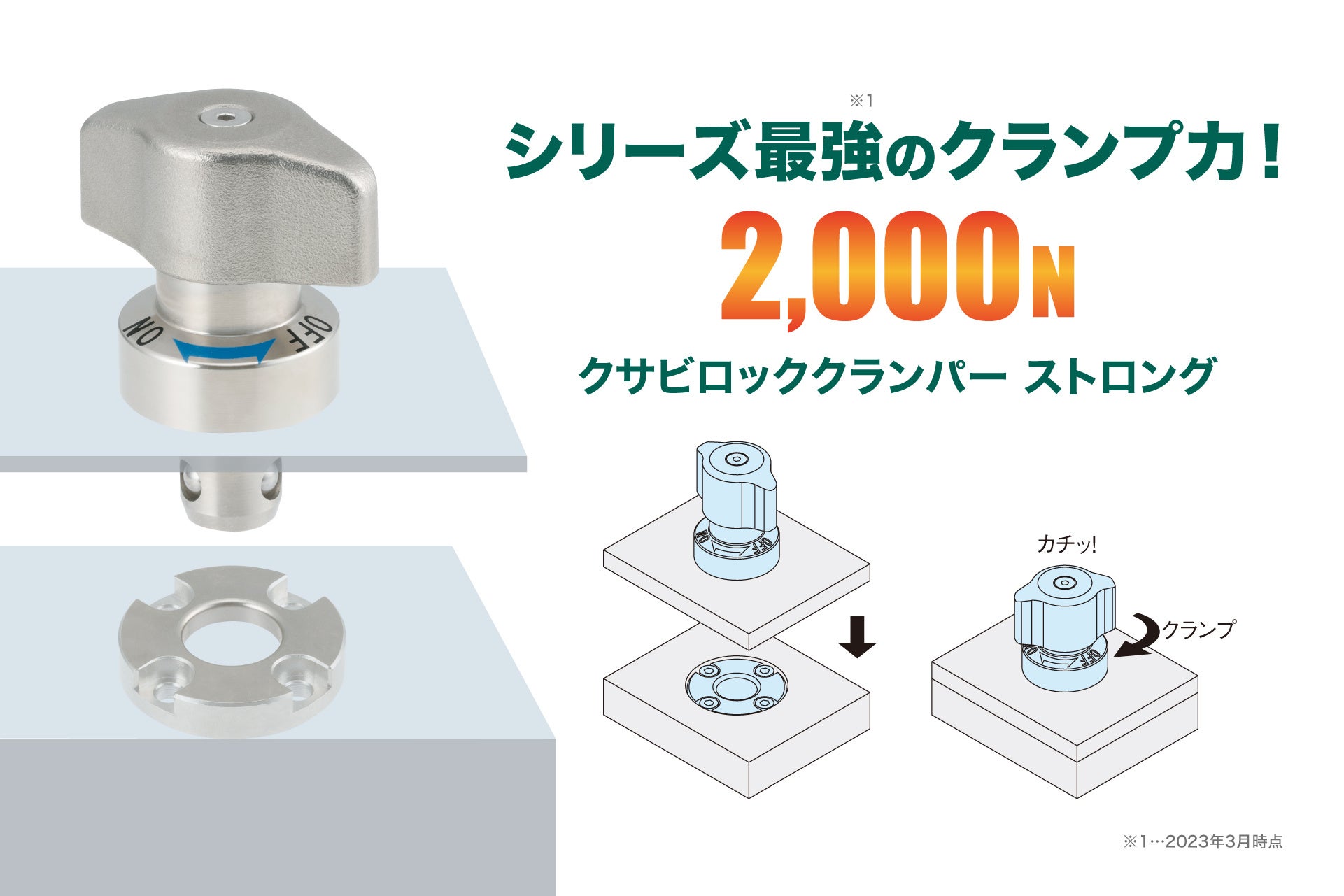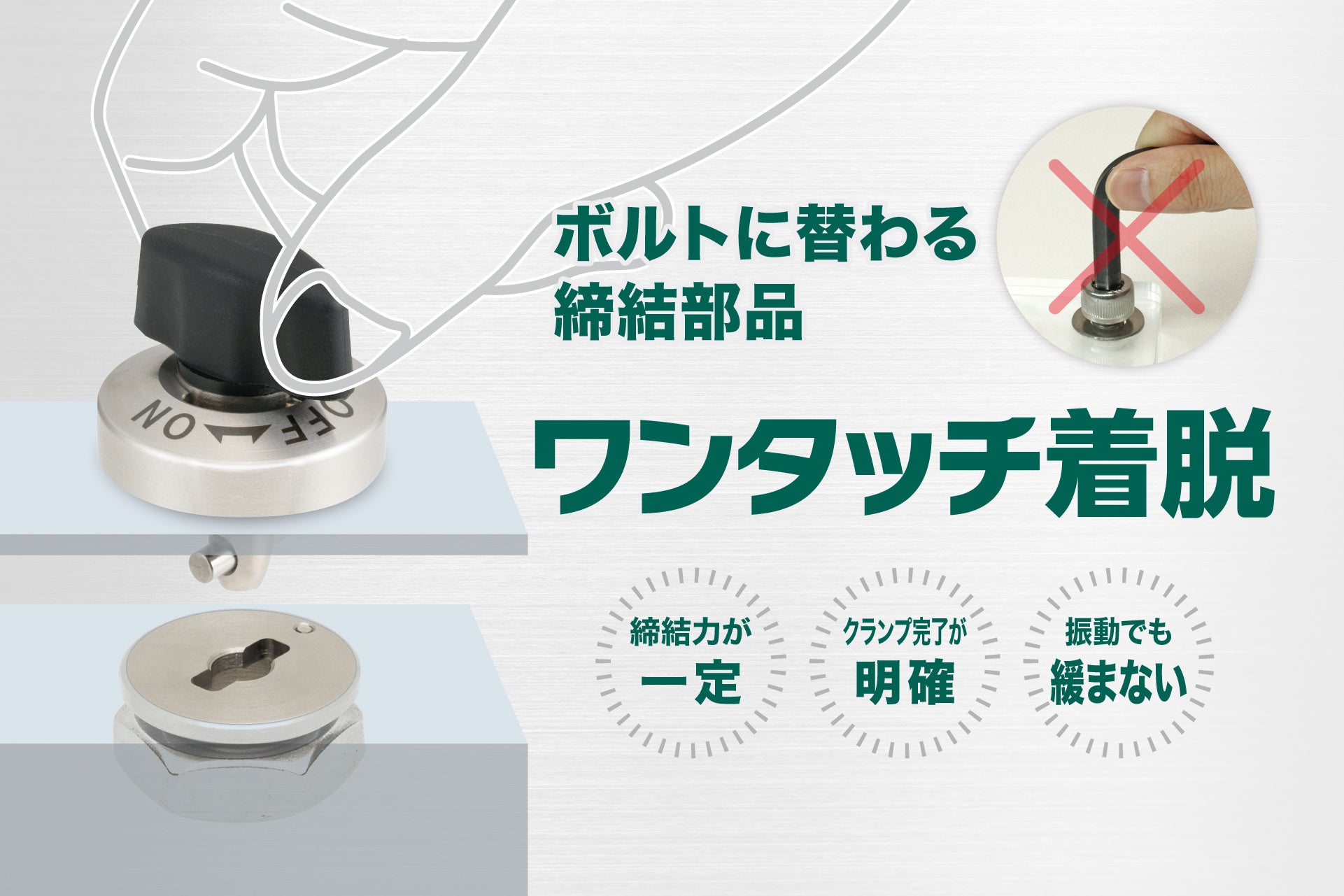 既存品同様、ノブを回すだけのワンタッチ操作で締結できます。また本体のON・OFFマーキングによりクランプ完了がひと目でわかります。内蔵バネとクサビによる機構を採用しているため強力に締結でき、誰が操作しても同じ力で締結できます。