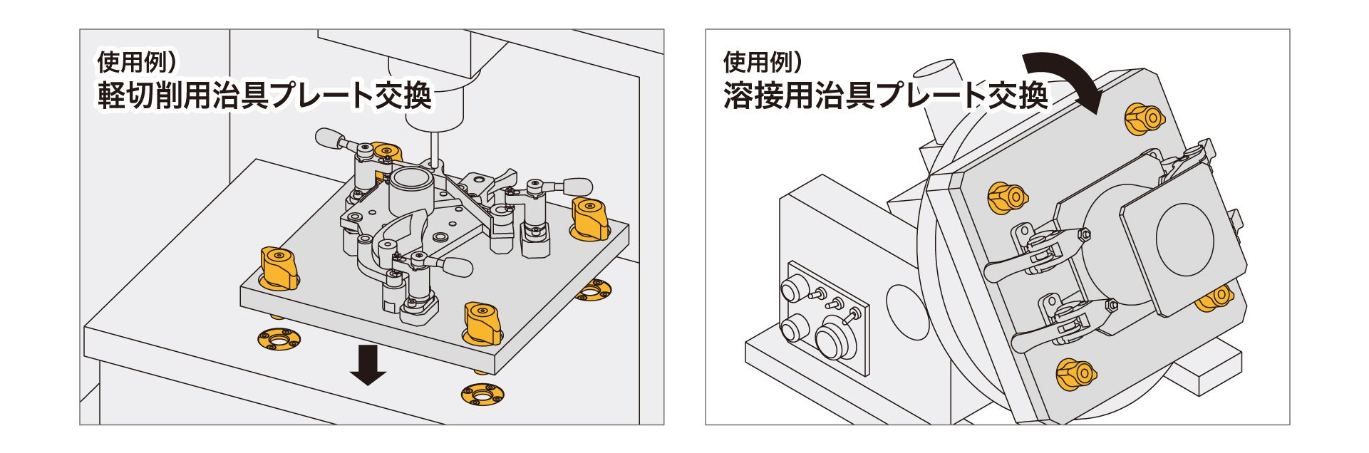 装置の型替えや各種交換(アタッチメント、治具、ガイド、プッシャー、リテーナ、ホルダー、メンテナンスカバーなど)の多様な箇所に適用できます。