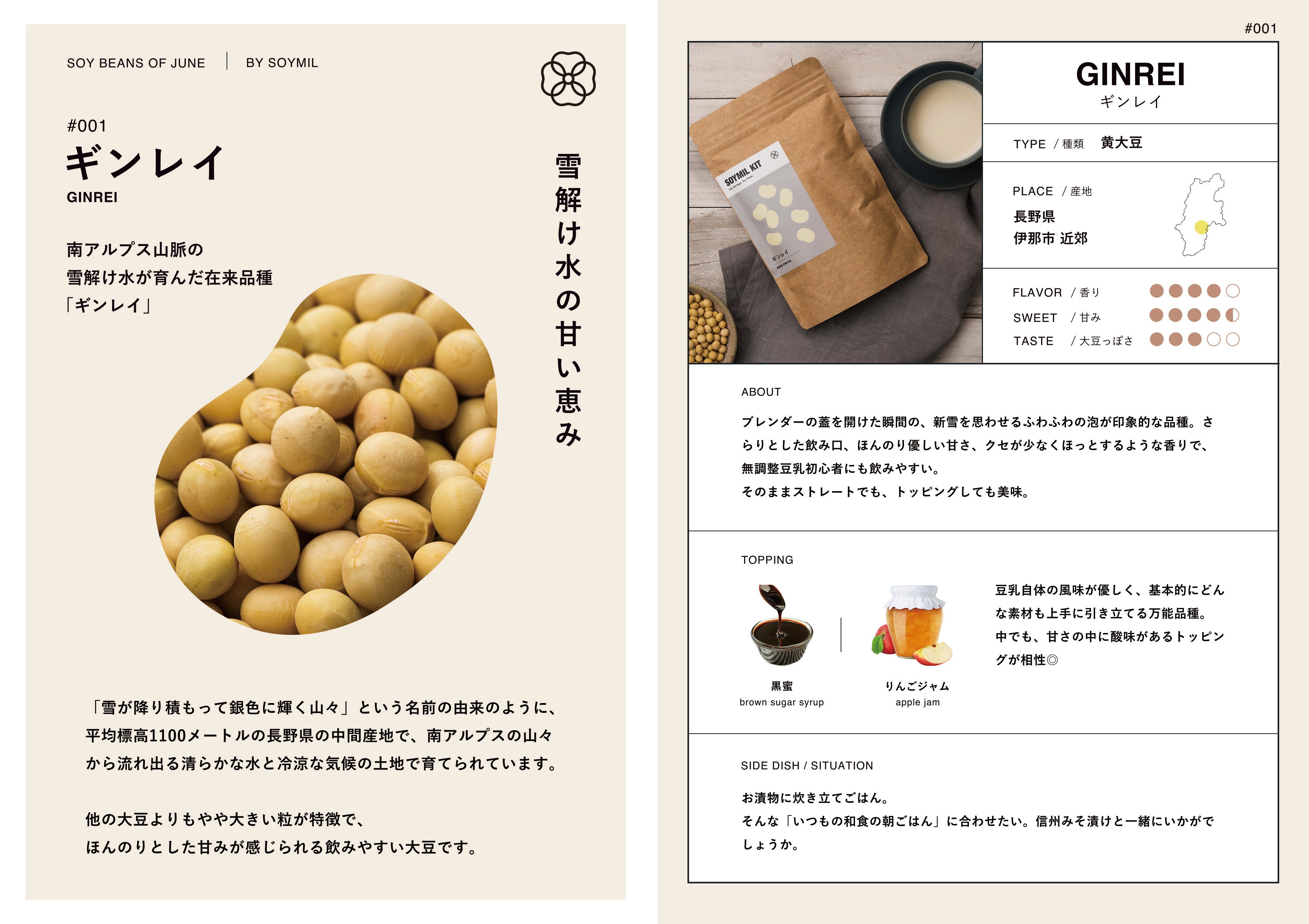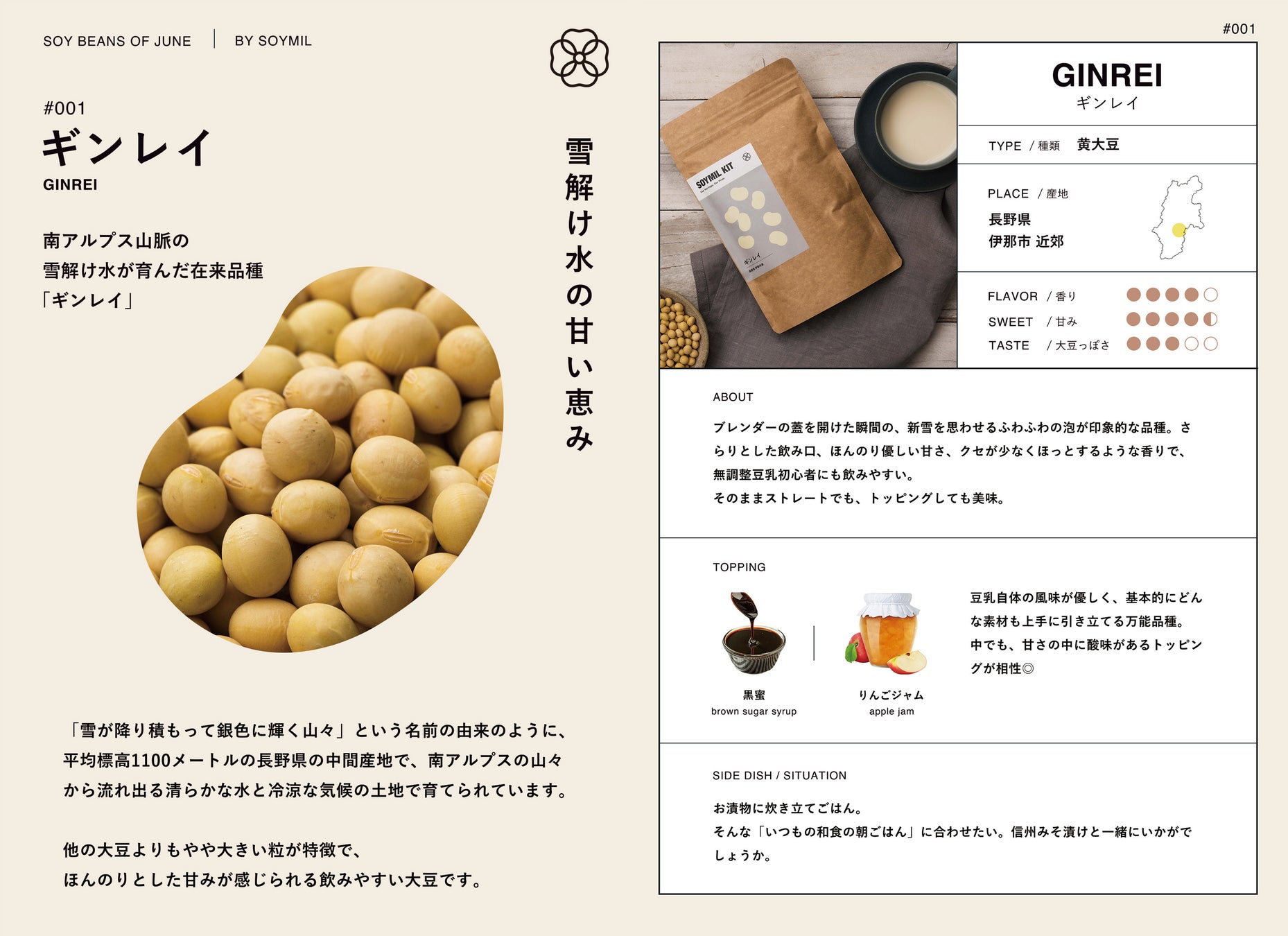 今回販売を開始するSOYMILマンスリープランでは、原産地の市町村に加え、その土地の気候や栽培環境について紹介しています。さらには、届けられる希少品種大豆と組み合わせて相性の良いトッピングの紹介や、香り・甘み・風味の三点から大豆の味わいを楽しむことができる内容となっています。