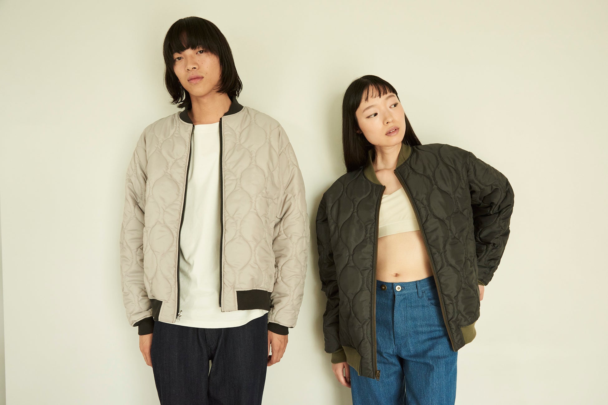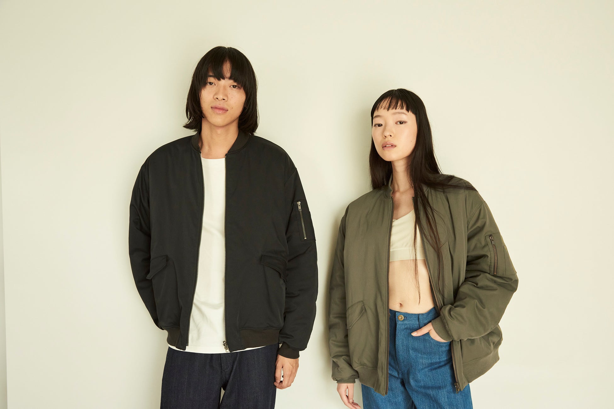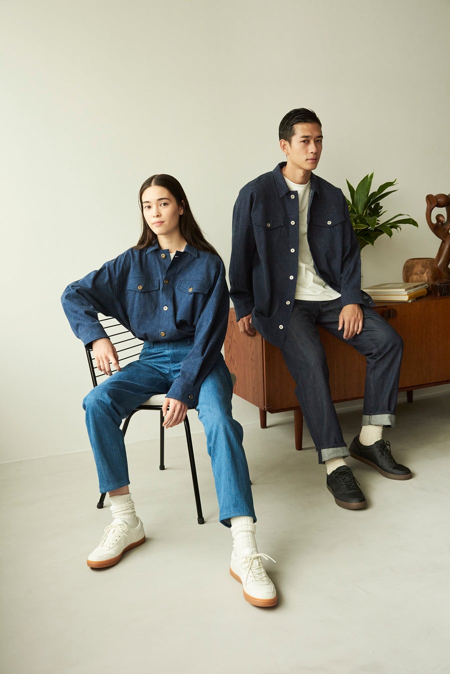 日本の紡績工場の落ちわたを再生した倉敷のデニムファクトリーの生地をメイン材に約98%採用したDENIM SHIRT JACKETと、セットアップでお召しいただける厳しい基準のもと栽培されたオーガニック由来の原料を90%以上使用した生地によるSLIM FIT DENIM PANTSをはじめ、ペットボトル由来のリサイクルポリエステルを約62%使用したマットな生地感のソリッド面と中わた入りキルティング面の2WAY仕様のREVERSIBLE FLIGHT JACKETと、同素材(中わた無し)を使用し、ウエストのドローストリング仕様が心地よいフィット感をもたらすRELAX FIT PANTS、後ろ身頃の切替デザインが洗練された印象を演出する天竺素材によるLOOSE TEE、そしてアッパーの約70%にリサイクルレザーを採用したクラシックなムード漂うガムソールが特徴のスケートボードタイプのUNIRONなど、大切な人とシェアできるアイテムが揃います。