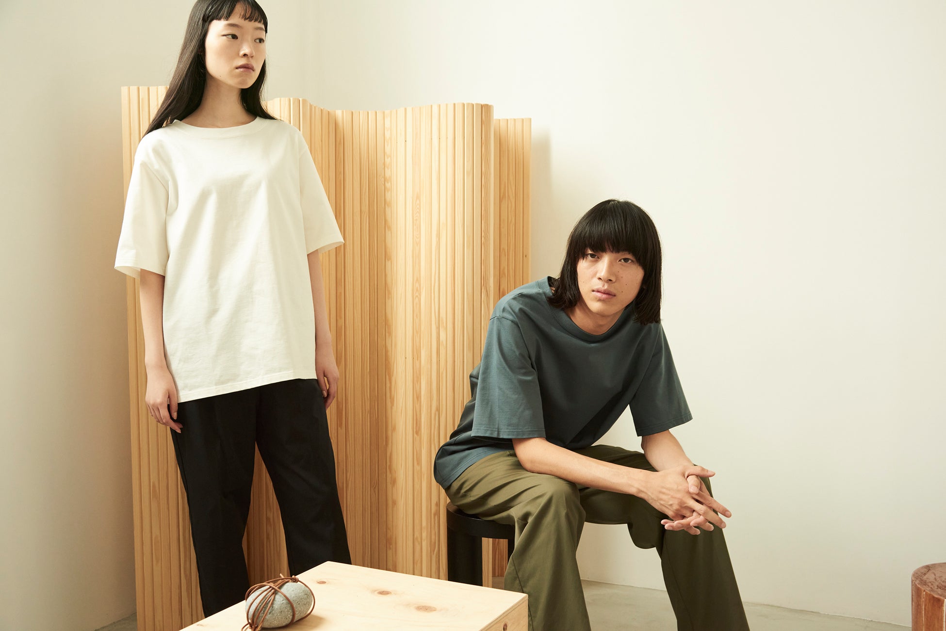 LOOSE TEE (以下左: OFF-WHITE 以下右: GREEN BLUE ) ¥9,900 RELAX FIT PANTS (以下左: BLACK 以下右: OLIVE GREEN) ¥19,800