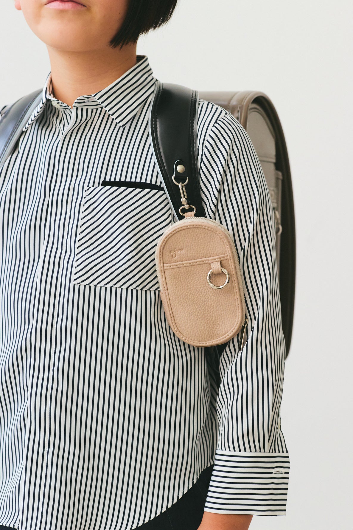 キッズ携帯や通学定期、鍵など、失くしてはいけない大事なものをこどもたちが身に着けておけるように、ランドセルの肩ベルト部分に取り付けが可能。