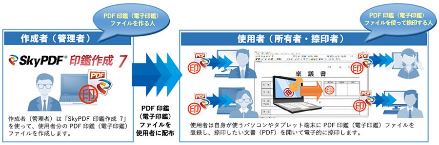 - *PDF印鑑とは、お手持ちの印鑑の印影データを『SkyPDF 印鑑作成 7』で取り込み、捺印者の氏名や会社名、所属などのユーザ情報を設定登録して作成された電子印鑑ファイルです。この電子印鑑ファイルを『SkyPDF Professional 7』もしくは『SkyPDF Standard 7』に設定登録することで、PDFファイルに電子的に捺印することができます。