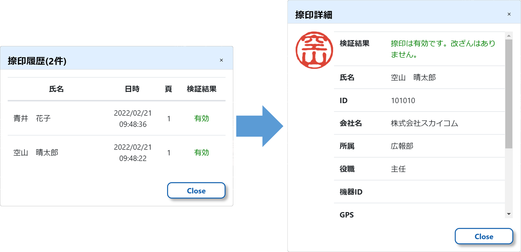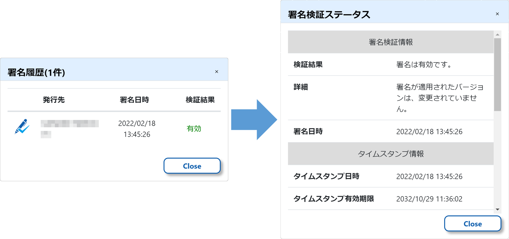 電子署名やタイムスタンプ付与後に文書が変更(改ざん・偽造)されていないか、電子証明書やタイムスタンプが有効な状態か、署名履歴から電子署名やタイムスタンプの検証結果を確認できます。