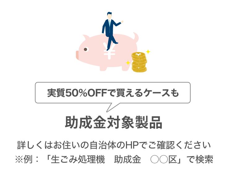 ゴミの減量はSDGsでの重要課題の1つです。家庭でできるゴミ減量の推進のため、多くの自治体で生ゴミ処理機の購入費の一部を補助する助成金制度を設けています。購入費用の1/3〜1/2程度の補助金が出る自治体が多く、お求めやすい価格で購入することができます。