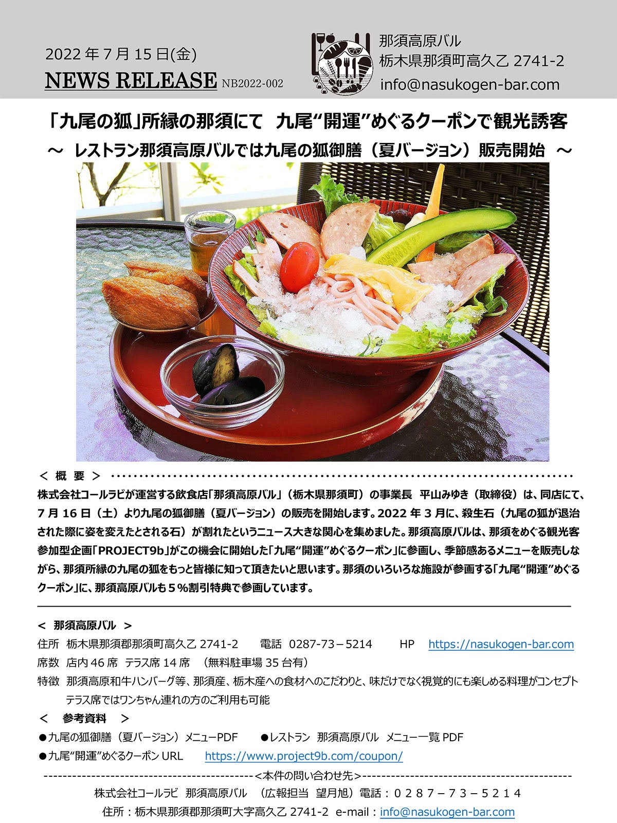 株式会社コールラビが運営する飲食店「那須高原バル」(栃木県那須町)の事業長 平山みゆき(取締役)は、同店にて、2022年7月16日(土)より九尾の狐御膳(夏バージョン)の販売を開始します。