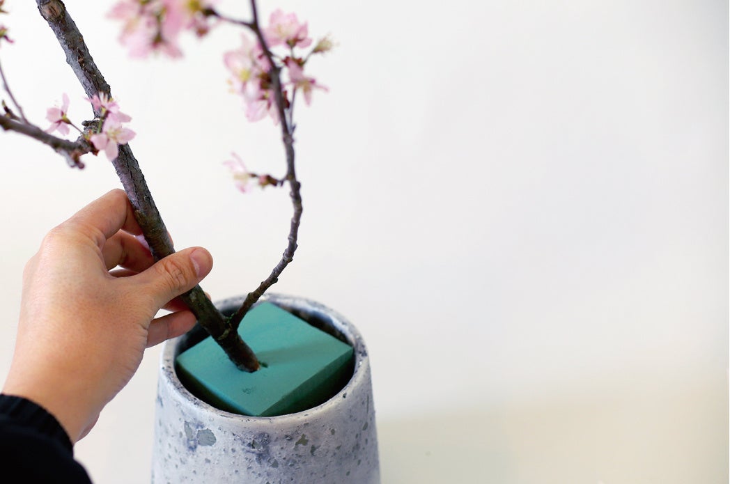 桜を自由にスポンジに挿します。桜の根元は水あげしやすようにカットしてあります。長さを調整したい場合は枝の根元を斜めに切ります。
