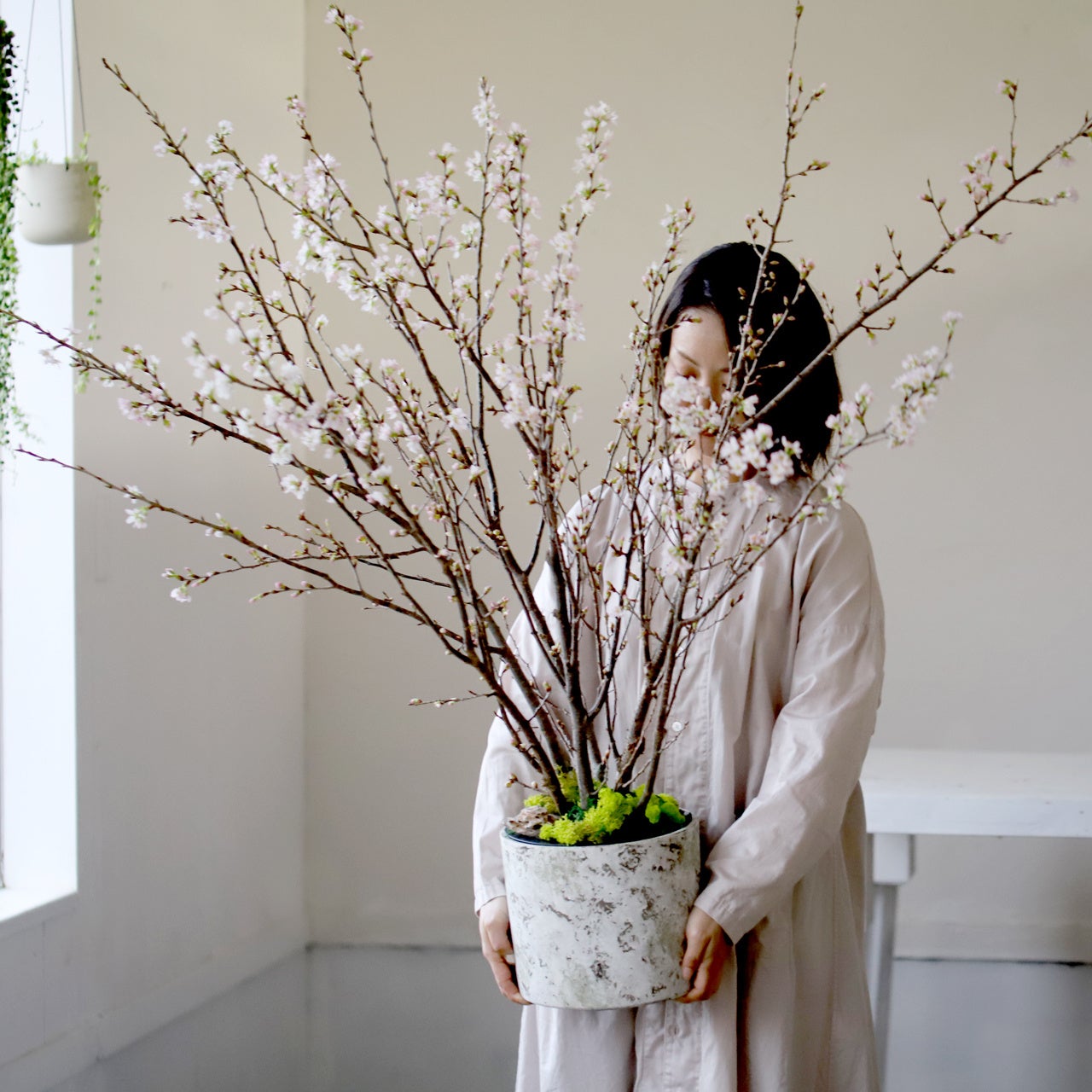 桜は水が好き。スポンジが常に水を含んでる状態が桜にとってはいい環境です。お届けする器は穴あきタイプを簡易防水したものとなりますので、水やりの際には器中央からあふれないようゆっくり水を注いでいただきますようお願いいたします。