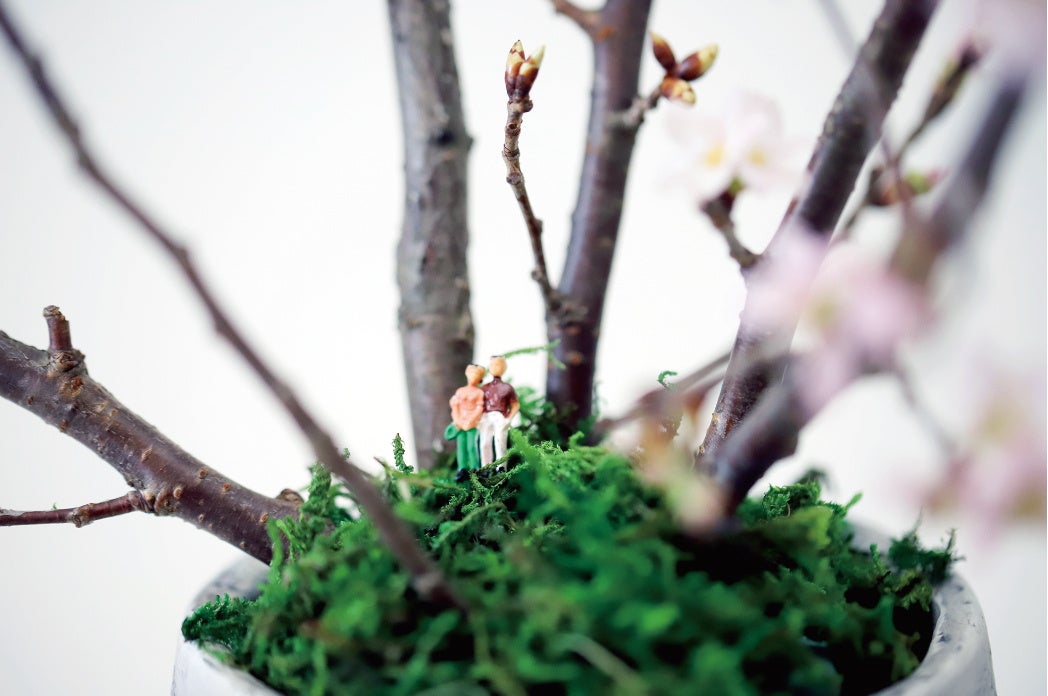 桜や器、ナズナ、石、作り方のわかる説明書まで、桜並木の景色を再現できる材料をワンセットでお届け。桜の枝は表情のちがうものを5本えらんでお届けしますので、手順通りに生けるだけで、まるで桜並木をお散歩しているようなお花見風景を、自宅につくることができます。