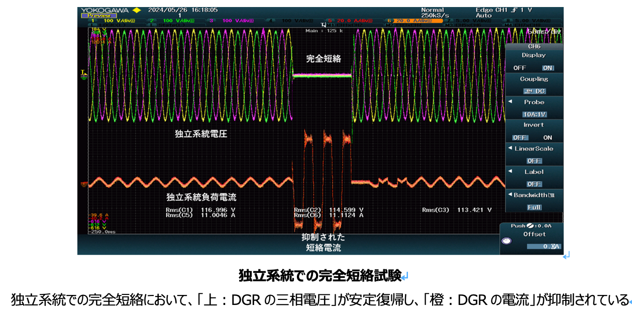 また、独立系統事故時におけるフォールトライドスルー(FRT: 系統擾乱時における運転継続性能)に関し、最も過酷な完全短絡試験も実施しました。