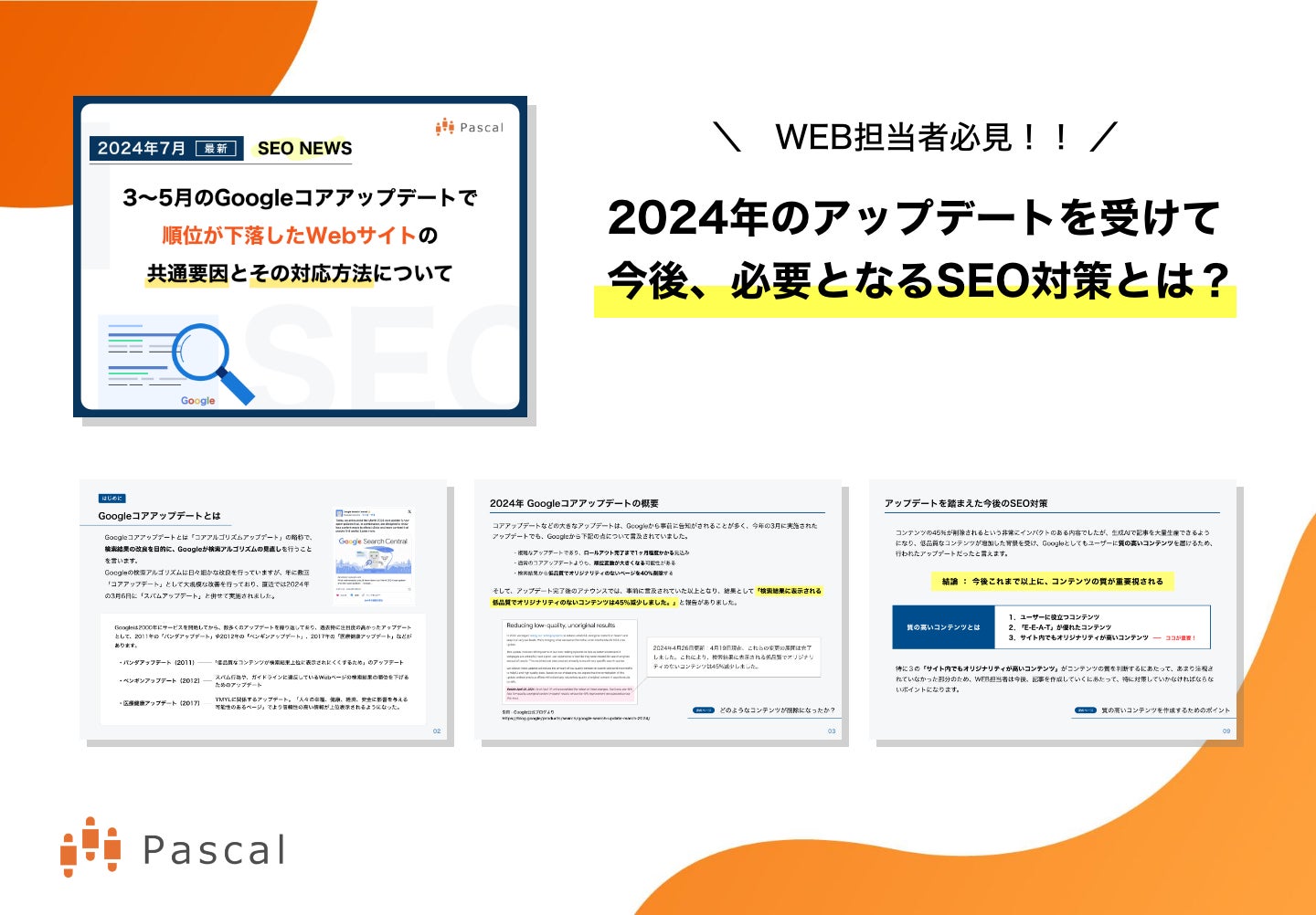SEOツール「パスカル」の開発・提供を行う株式会社オロパスは、2024年3月から5月にかけて実施された、Google「コアアップデート」「スパムアップデート」の影響を受けて、Webサイトに影響があった方向けに、下落になった要因とその対応方法についてまとめた「2024年7月最新 3月〜5月のGoogleコアアップデートで順位が下落したWebサイトの共通要因とその対応方法について」を無料公開いたしました。