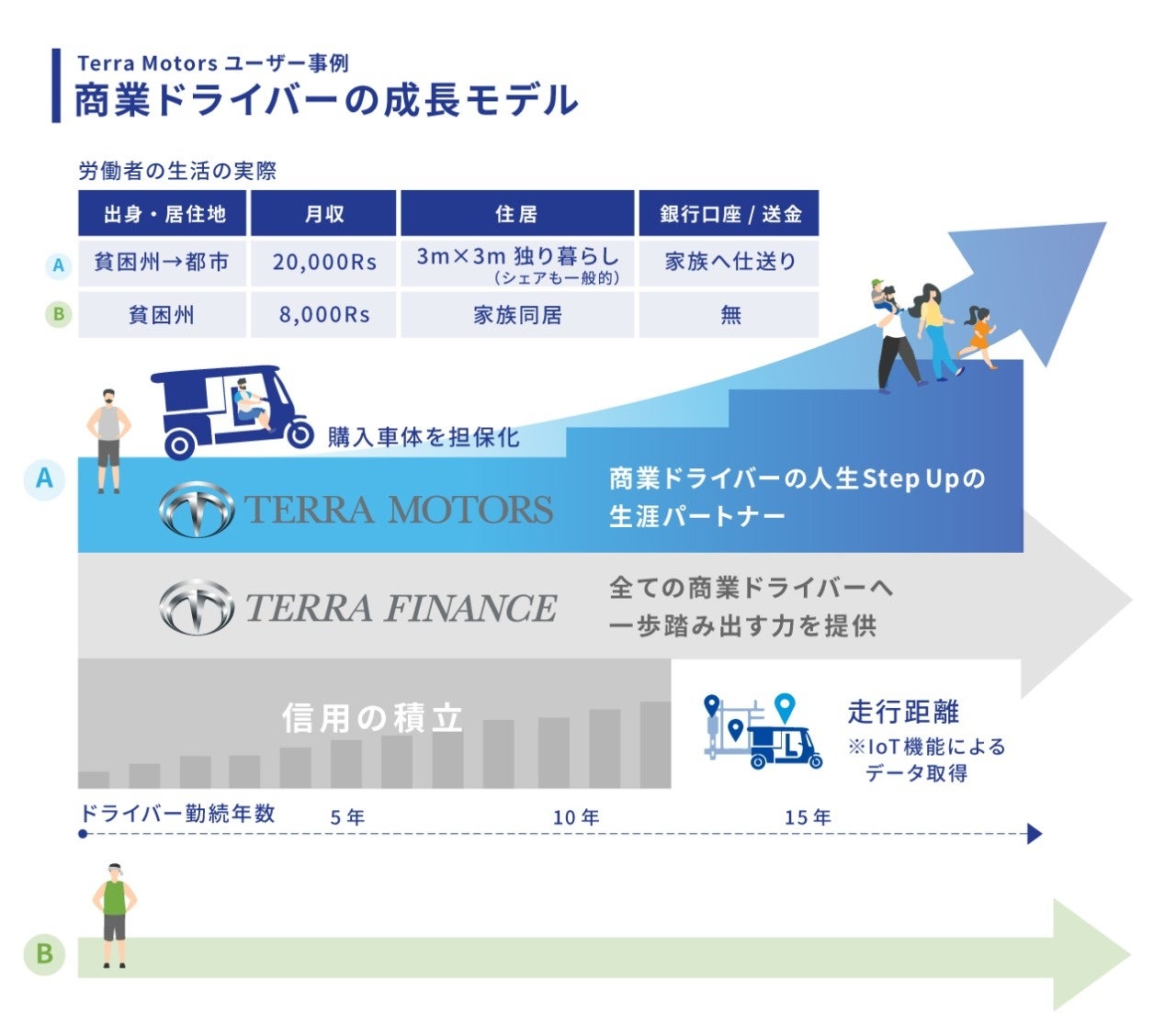 テラモーターズのEV車体は、IoTによる走行データ(※2)を取得し、リアルタイムで追跡可能となっております。上記の図の通り、貧困州出身であることなど様々な社会的背景から、信用スコア獲得へのチャンスもないゼロ地点として定義します。階層の変更や農業以外の就労の選択肢が難しいのです。ファイナンスは、車体を購入と同時に担保化できる仕組です。まず、商業ドライバーとしてスタート地点に立ち、得た収入で家族へ仕送りする「社会的な自立」を実現することができます。そして、重要な点として、走行距離と勤続の時間の掛け合わせが「社会的信用」として蓄積される仕組みとなります。こうした地場のライフスタイル理解、サービス構築によって、顧客層との信頼関係を手堅いものとし、ファイナンスサービス運用において一定のデフォルトリスクの減少効果が得られると考えております。