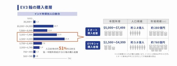 EV3輪の消費者層は、顕在・潜在層を含めると世帯年収2,500ドル〜7,500ドルの低・中所得者層です。具体的には、現在、テラモーターズのEリキシャを購入する顧客は、人口全体の約29.4%を占める世帯年収2,500ドル〜5,000ドルほどの低・中間所得層です。