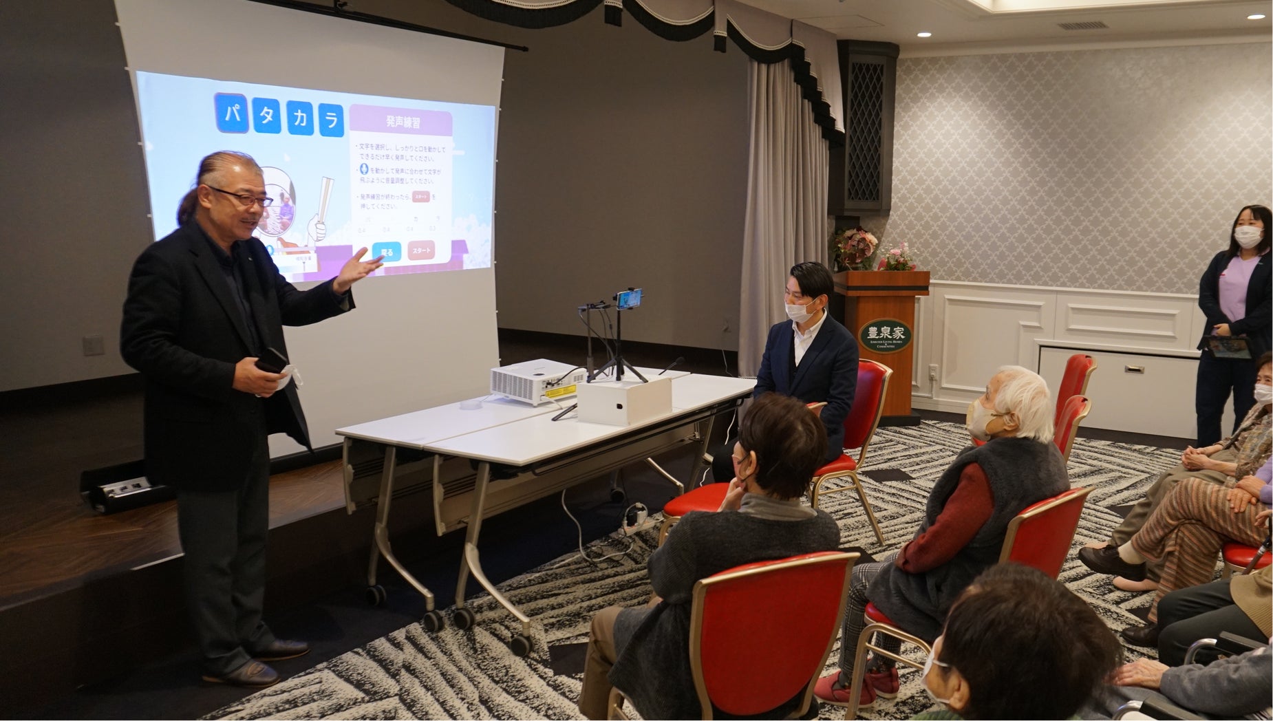 イベント終了後、CCRC豊泉家 芦屋山手を運営する(福)福祥福祉会の阿久根賢一理事長から、「ご高齢になると新しいことに取り組むのが中々難しい方が多いが、音声だけでなく視覚的にも楽しめる分かりやすいゲームで、皆さんすんなり馴染めて楽しんでおられたのが印象的。アプリが完成したらぜひ施設のレクリエーションに活用したい。」とコメントいただきました。